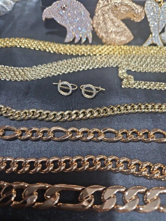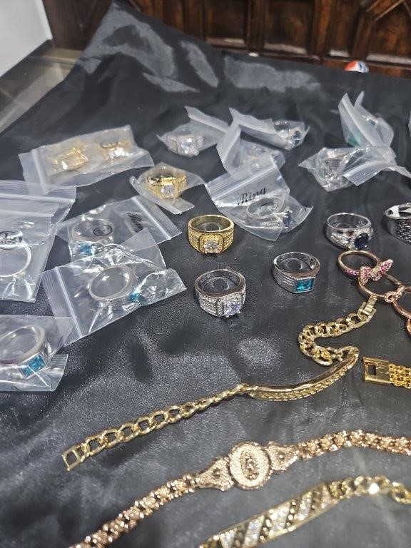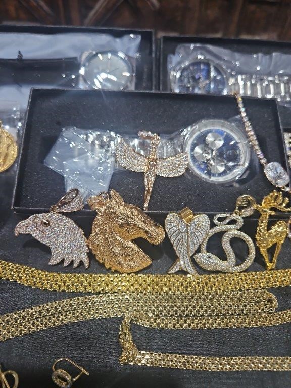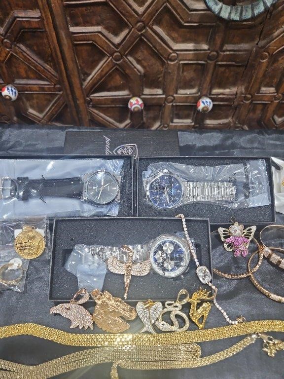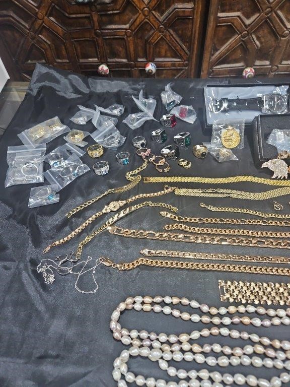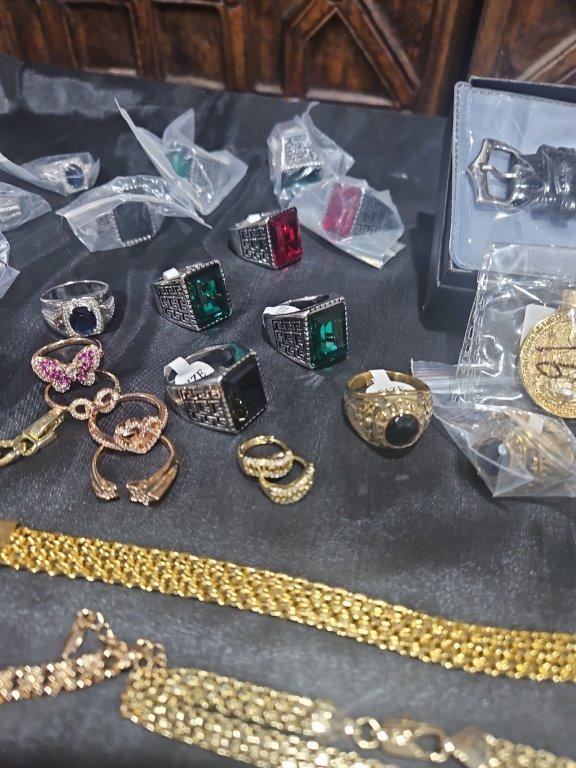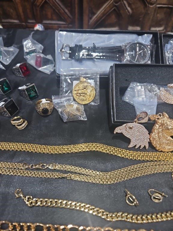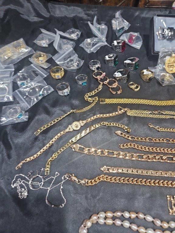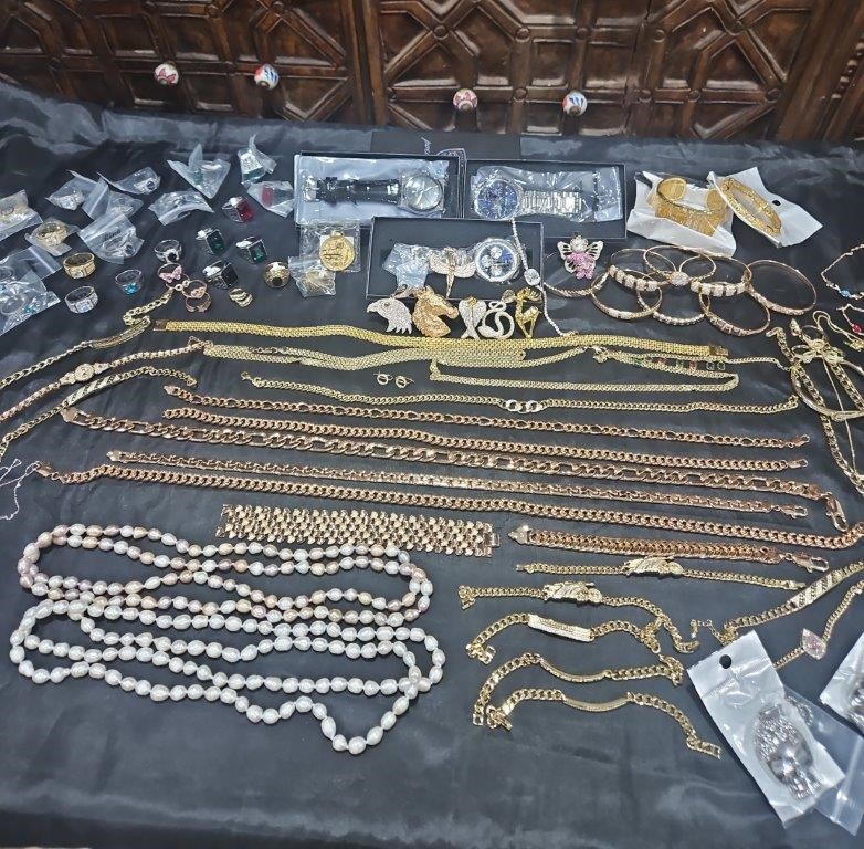 • Detalis products: 1-19 pcs Bracelets with stamped 2- 16 pcs Chains sizes(45cm-50cm-55cm-60cm) Mix size with stamped. (18k/22k /s925 /Italy) 3- 1 pcs set Bangles and Rings with stamps (22kGold-Filled/italy) 4- 26pcs Men`s Rings 5- 2 pcs Set Pendants and chain with extra 925 silver chains with simulated diamonds stones. 6-9pcs Bangles with simulated diamonds 7-1 Set Earring & Ring & Necklace & Bangle 8- 7 pcs pendant with simulated diamonds and 18k stamps 9- 1 set Earring & Rings & necklace with PT950 stamps and simulated diamonds stones 10- 2 pcs Pearl Necklace (1.2m) 11- 4pcs x18k Earrings 12- 3watch with orginal boxes.