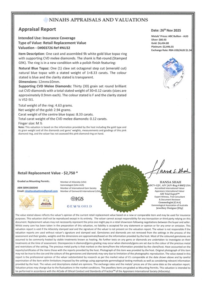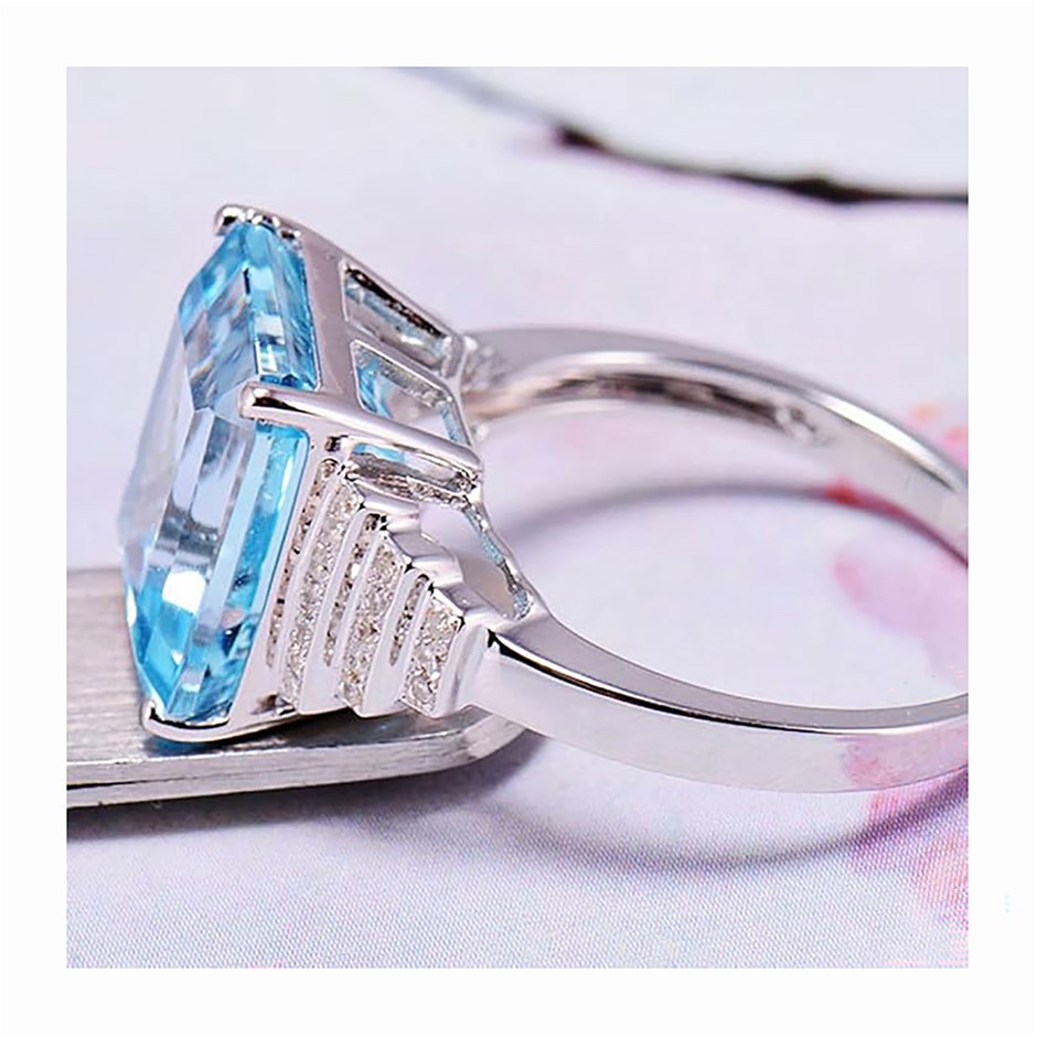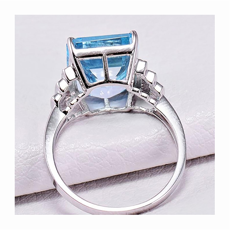 Natural Blue Topaz: One (1) claw set octagonal step cut (emerald cut) natural blue topaz with a stated weight of 1=8.33 carats. The colour stated is blue and the clarity stated is transparent.