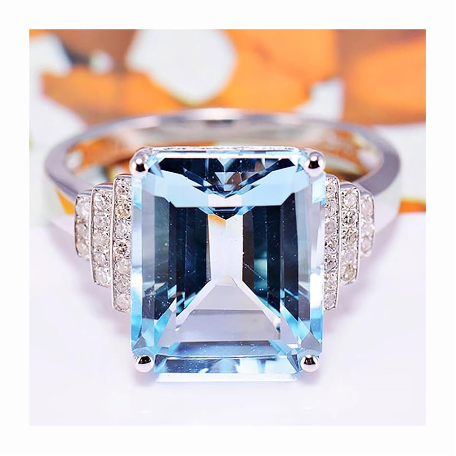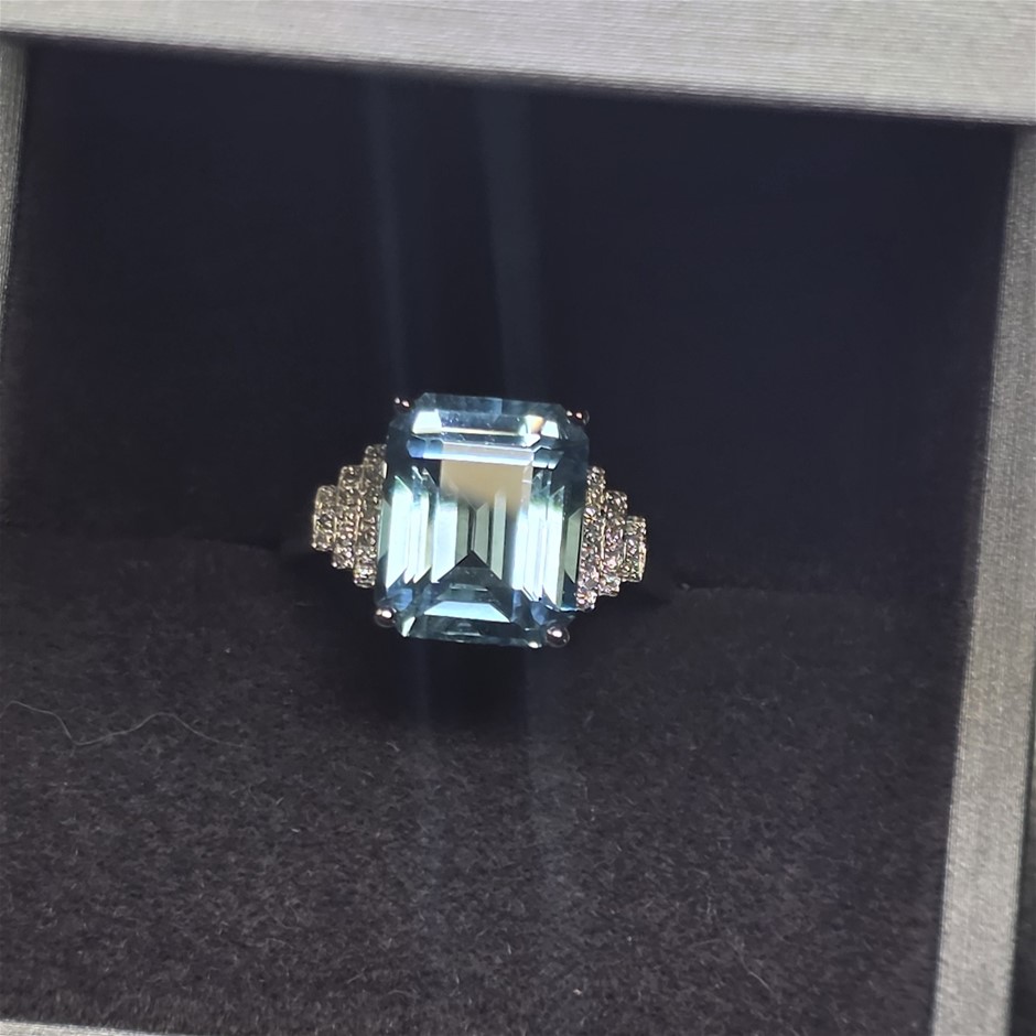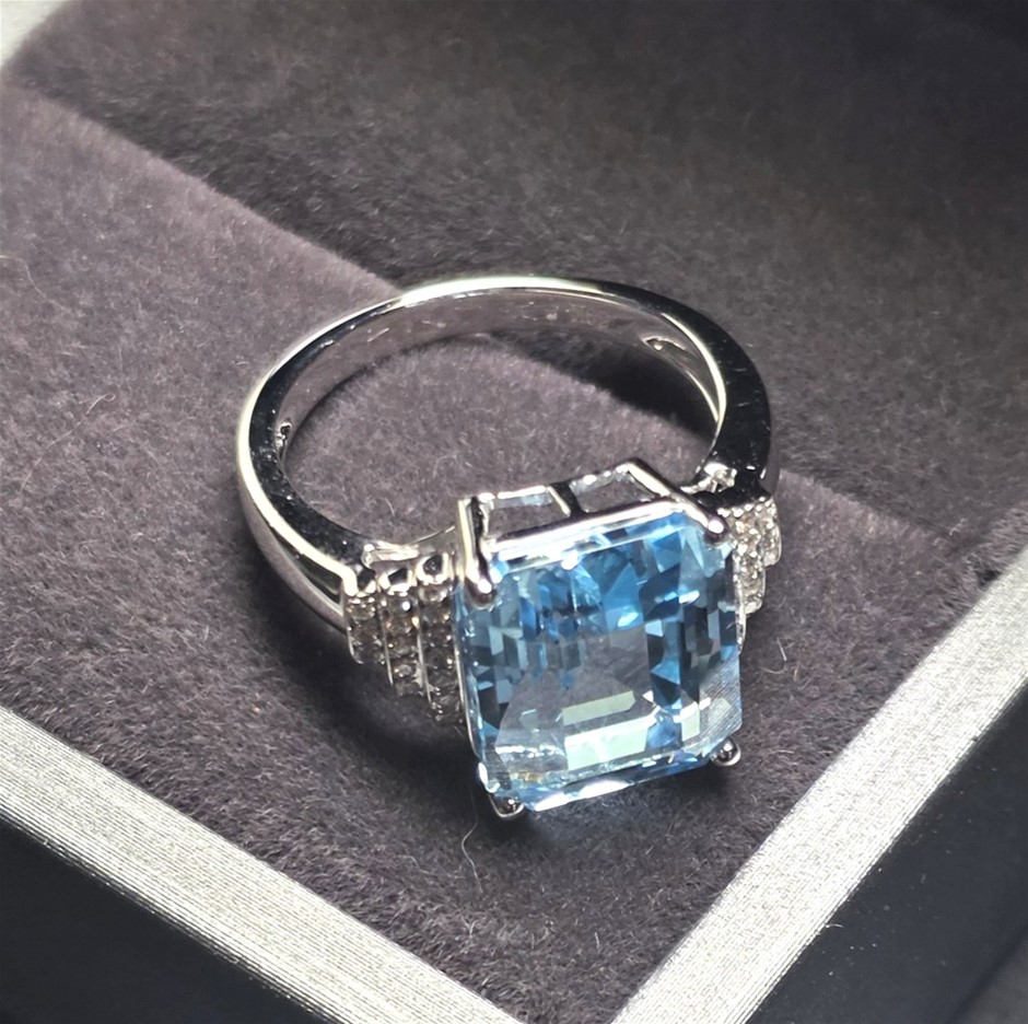 Item Description: One cast and assembled 9k white gold blue topaz ring with supporting CVD melee diamonds. The shank is flat-round.(Stamped G9K).