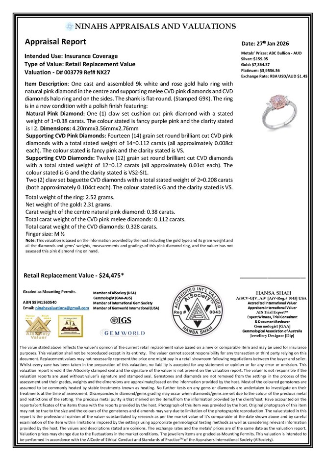 Item Description: One cast and assembled 9k white and rose gold halo ring with natural pink diamond in the centre and supporting melee CVD pink diamonds and CVD diamonds halo ring and on the sides. The shank is flat-round. (Stamped G9K).
