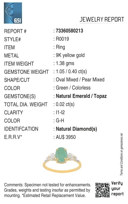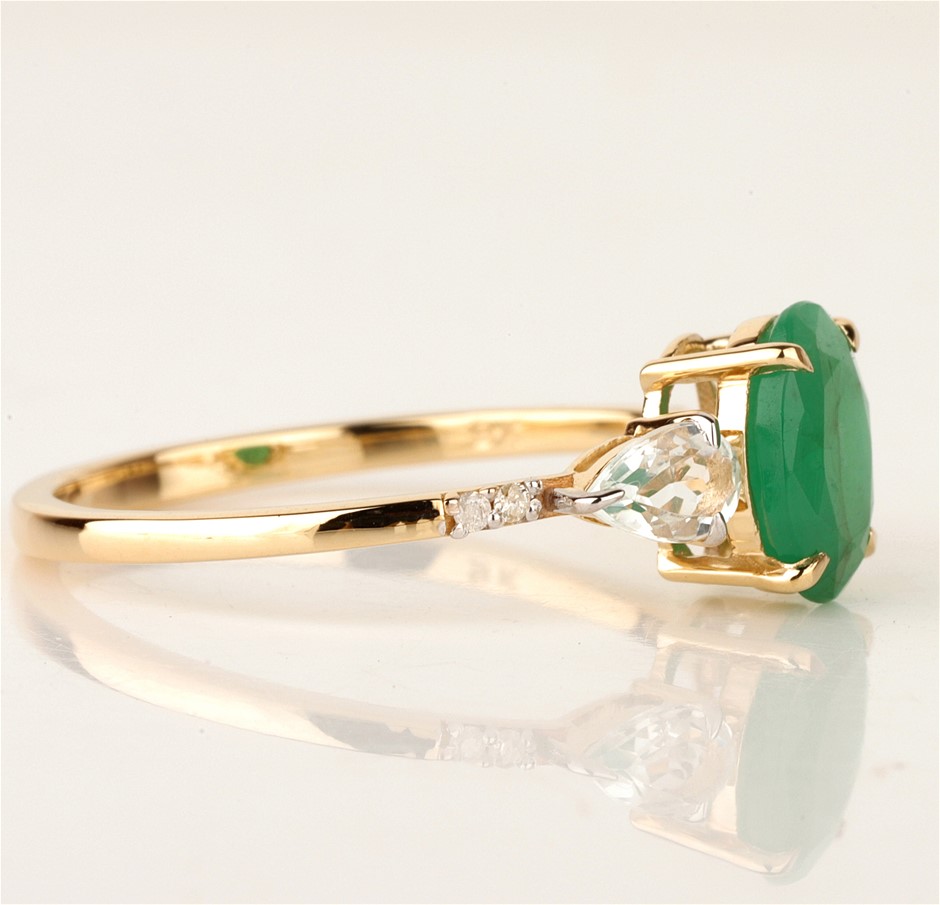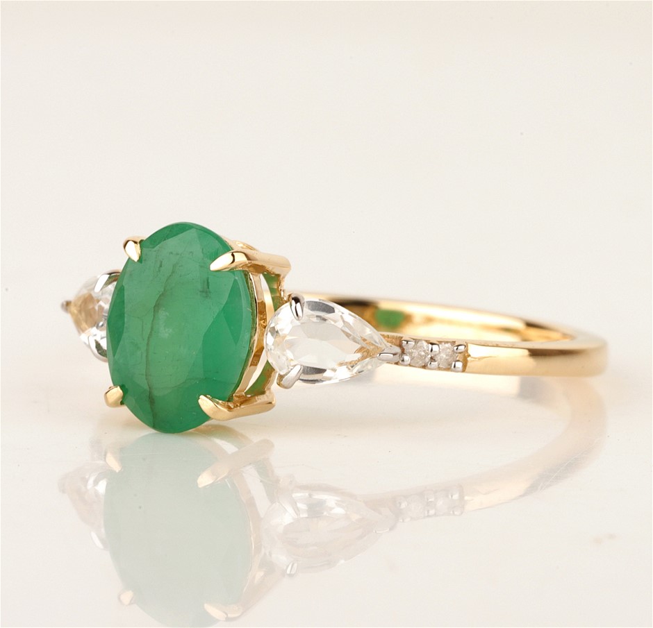 • The Ring consists of (1) Oval Brilliant Natural Emerald & (2) Pear Brilliant Cut White Topaz.