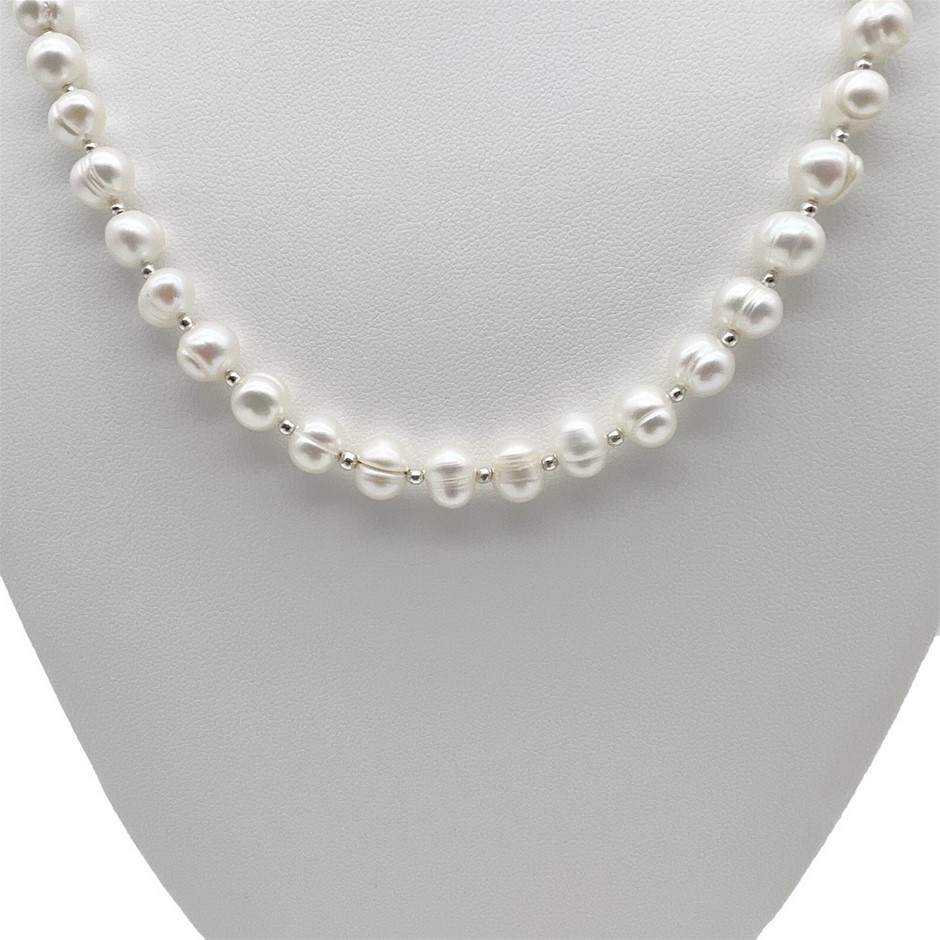 Natural 7-8mm White Freshwater Pearls & Spacer Beads Platinum Plated Necklace.