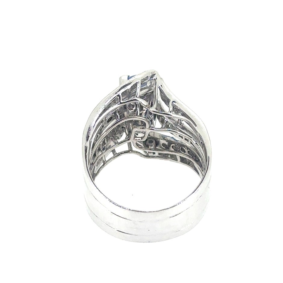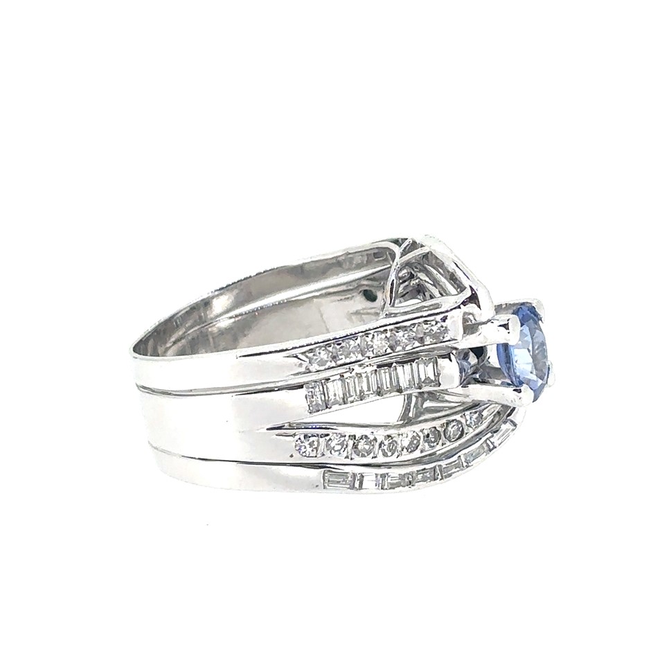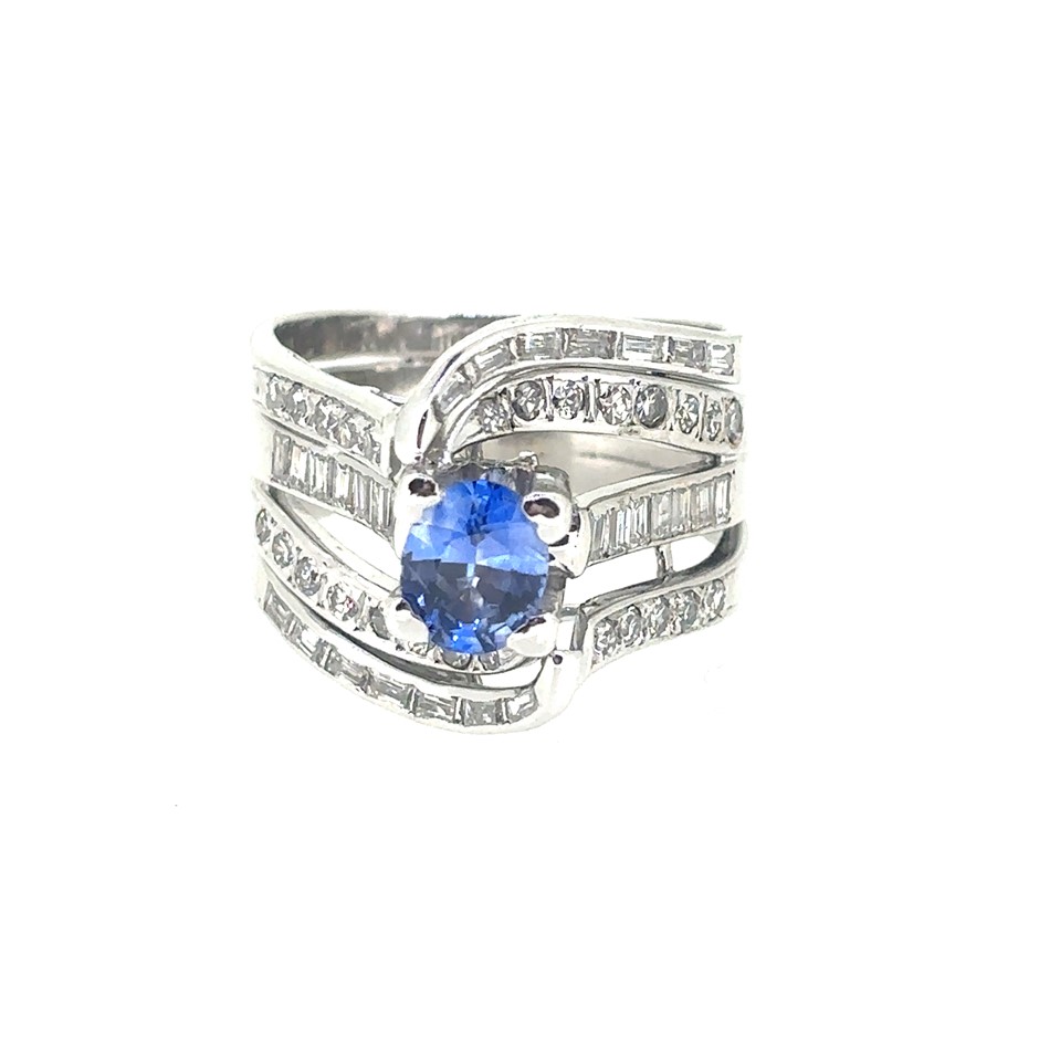 1.22ct a round cut Ceylon Sapphire & 1.10ct 26 round and 28 Bagette Stones Dia. G/VS-SI Ring 14K White Gold