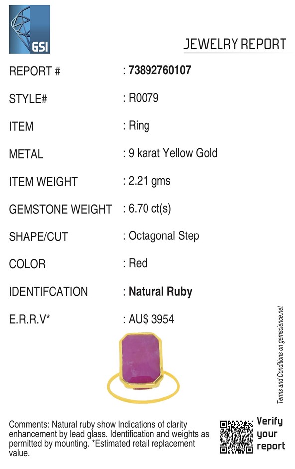 Yellow Gold Natural Ruby Ring with Valuation