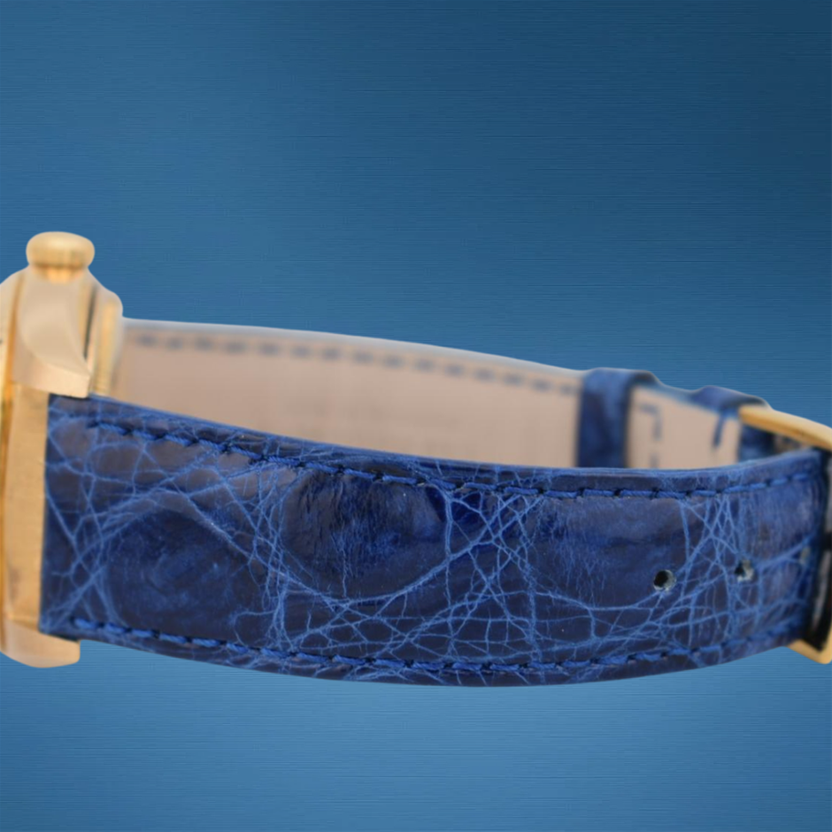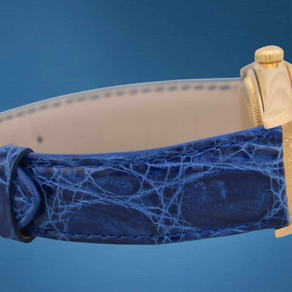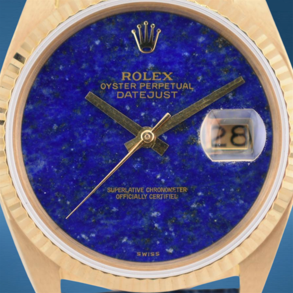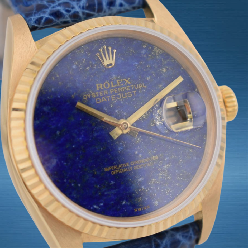This Rolex Datejust 16018 with its rare lapis lazuli blue dial combines timeless luxury with a distinctive and striking natural stone face, elevating the classic 36 mm Datejust design. Its solid yellow gold construction and dependable automatic movement make it a standout piece for collectors and enthusiasts alike.