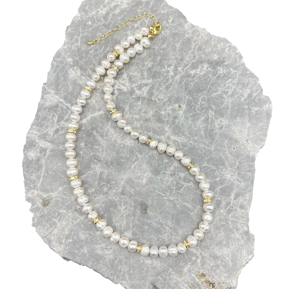 Natural 7-8mm White Freshwater Pearls & Gold Plated Rhinestone Necklace.