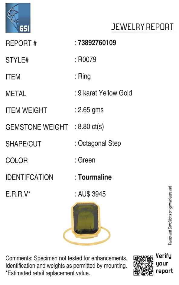 • The Ring Consists Of (1) Octagon Brilliant Natural Tourmaline.