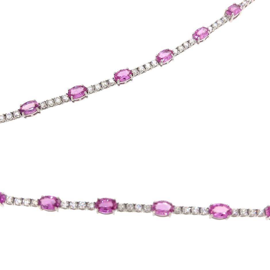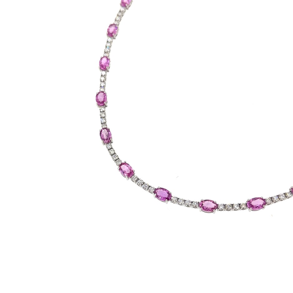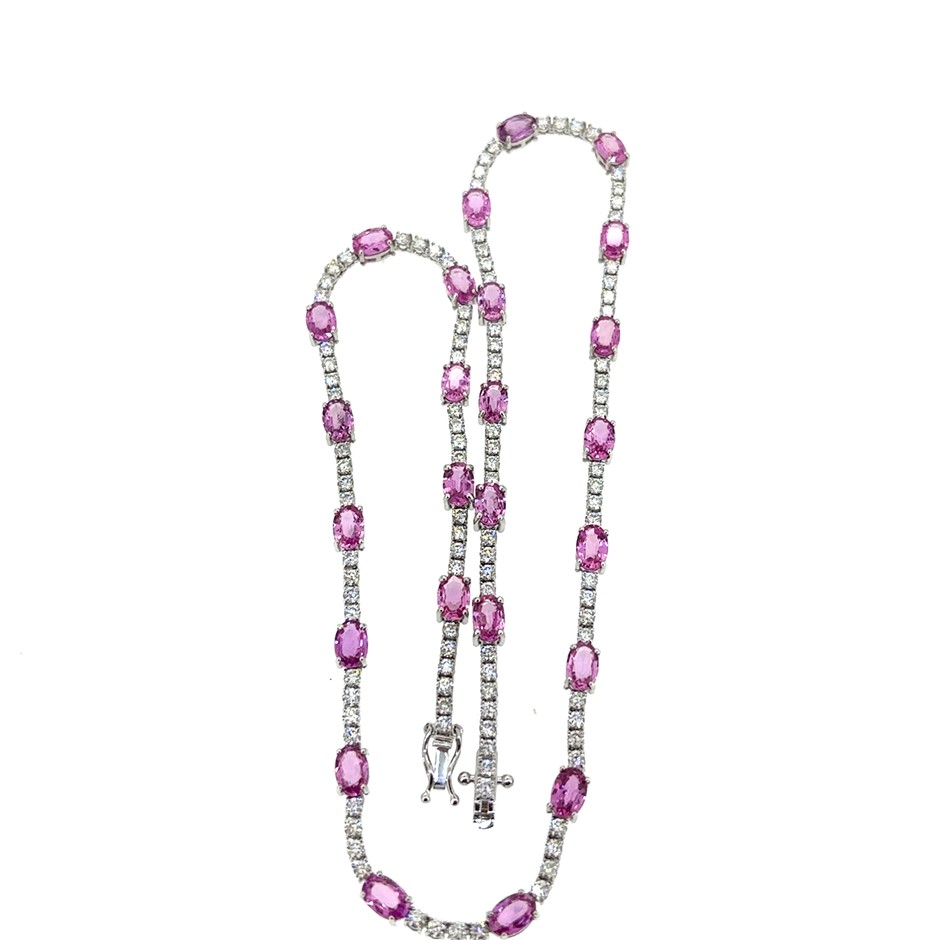 14.10ct 25 Stones Oval Cut Pink Sapphire & 4.55ct 110 Stones Round VS/G Dia. Necklace 18K White Gold