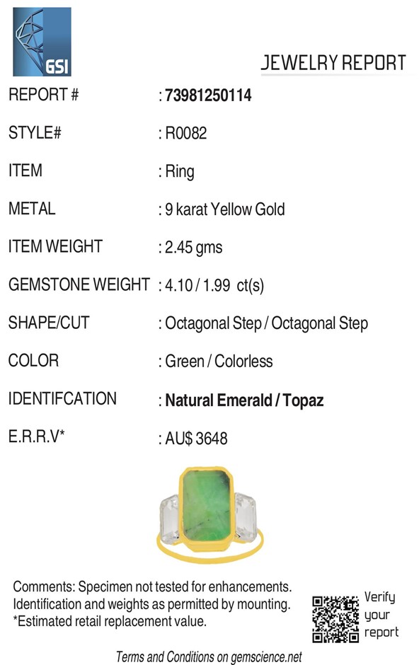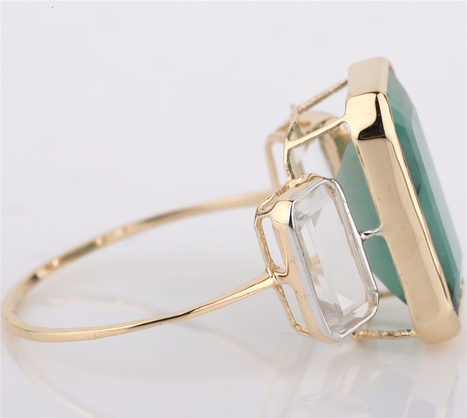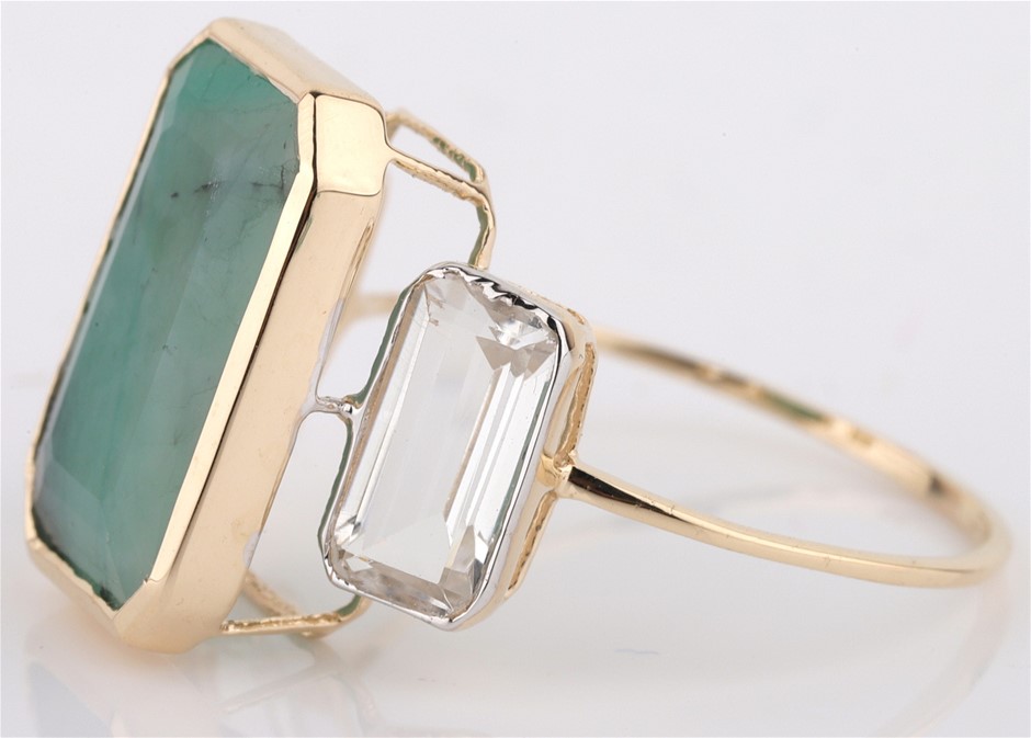 Yellow Gold Natural Emerald / Natural White Topaz Ring With Valuation