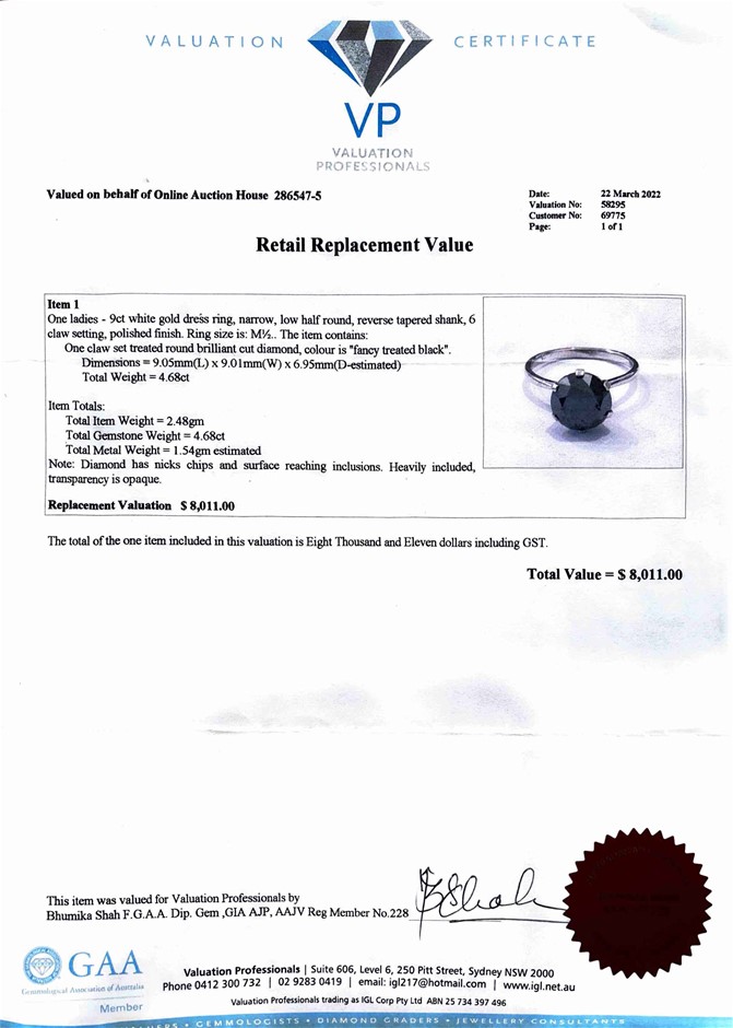 The Estimated Replacement Value does not represent a retail price or resale value of the item. It is an estimated value of the cost of replacing the item and is the opinion of the registered jewellery valuer based on the criteria detailed above. Variations may occur due to market fluctuations.