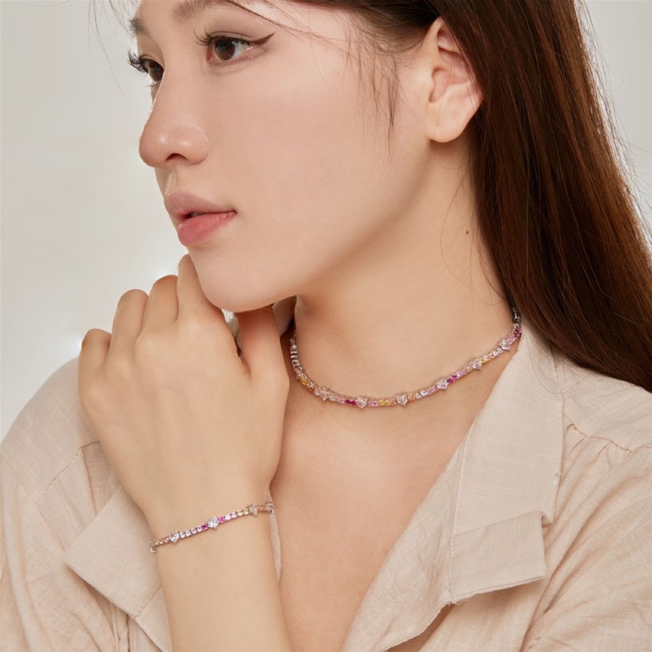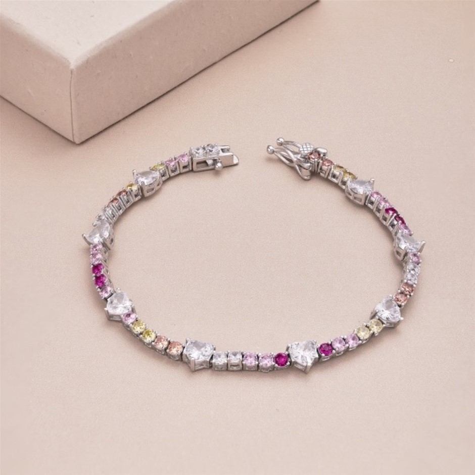 Heart Multi Colour Simulated Diamonds 925 Sterling Silver Tennis Bracelet