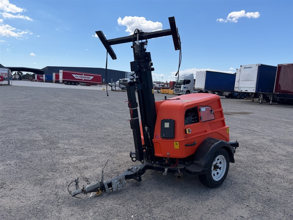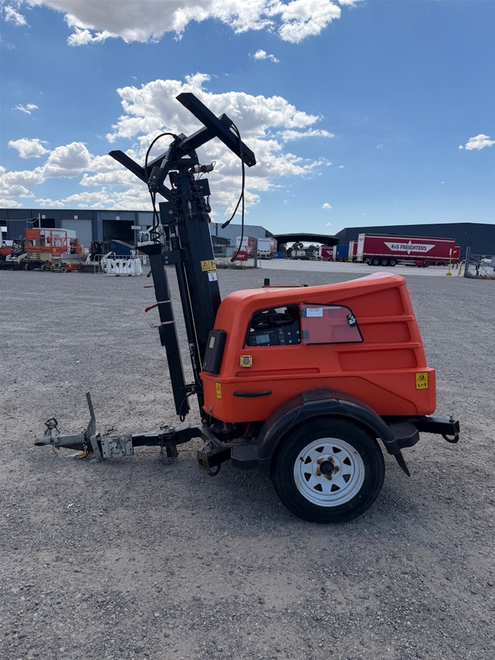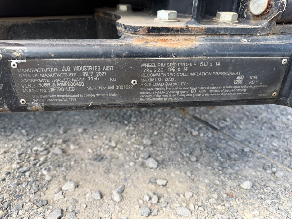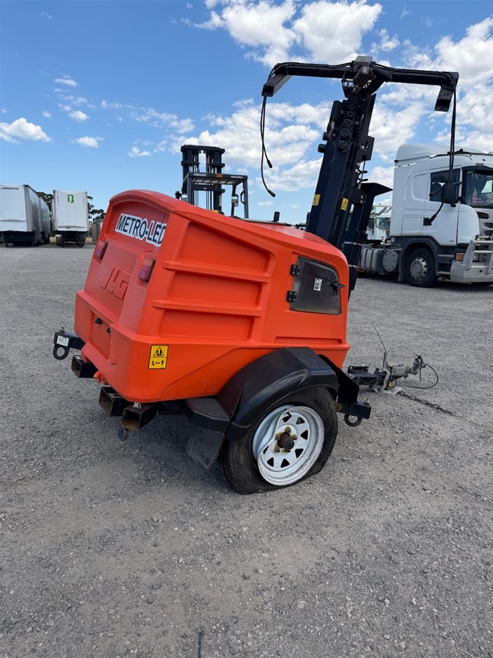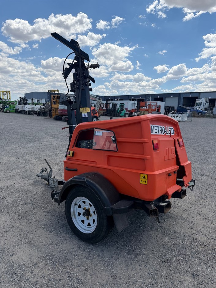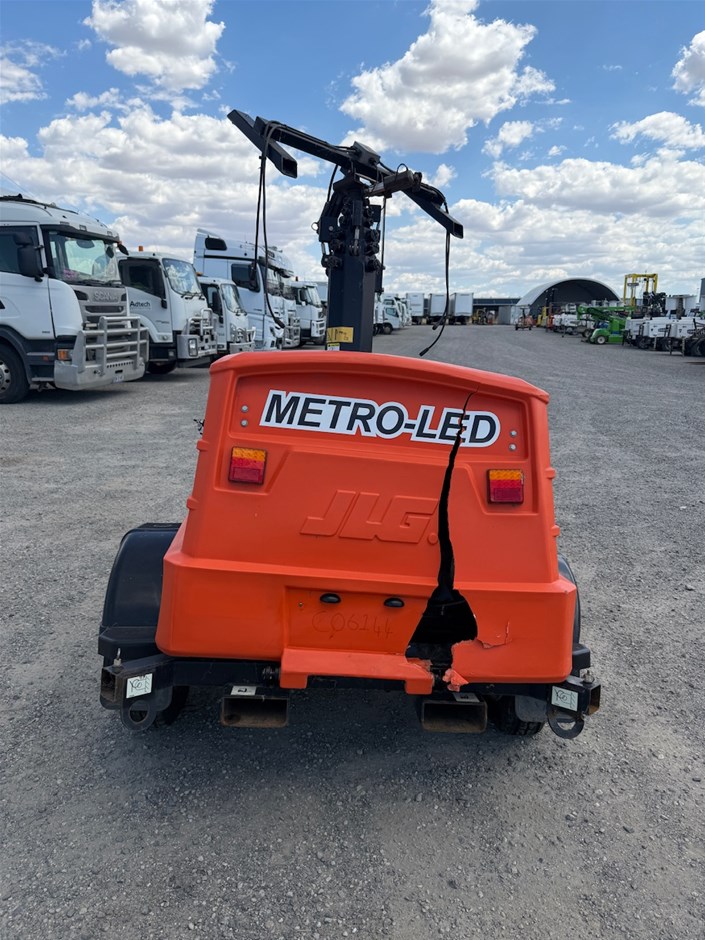 • 2021 JLG Light Tower Twin Cylinder Diesel. Model Metro LED. VIN 6J5PLJLG1MP000463. DOM 09/21. ATM 1150 kg. Tyres 185R14 5 Stud Rims. 50 mm Coupling.