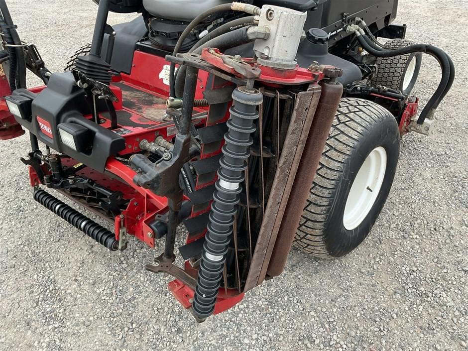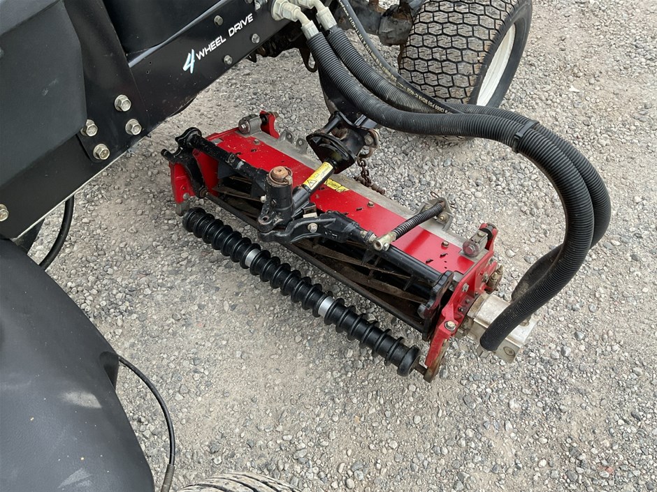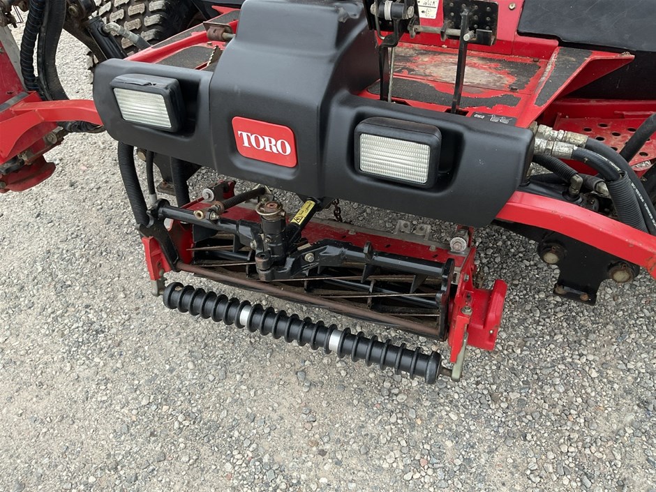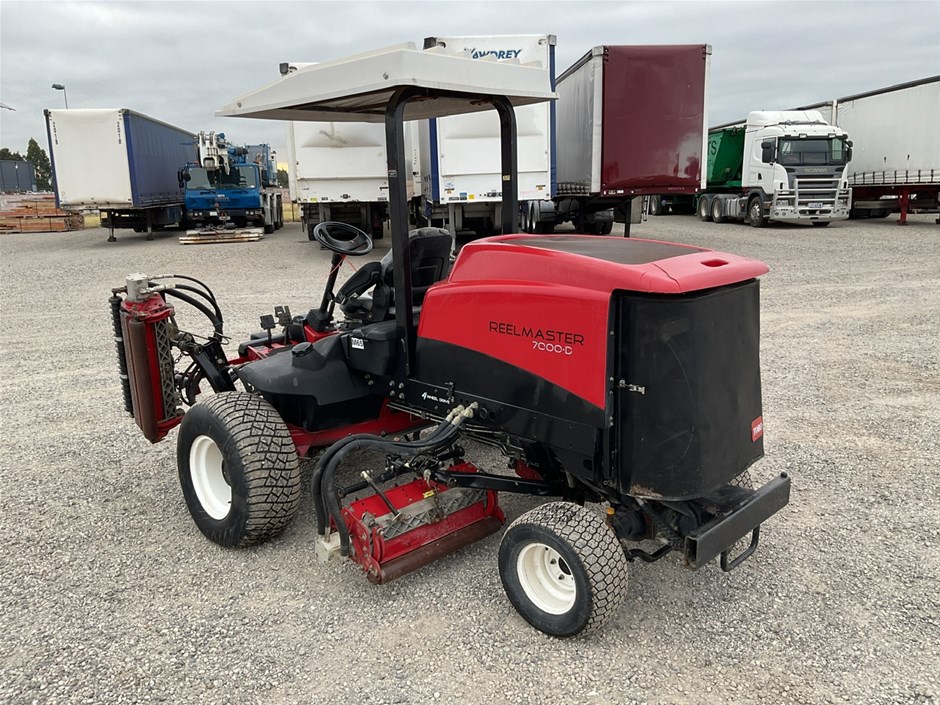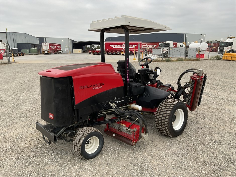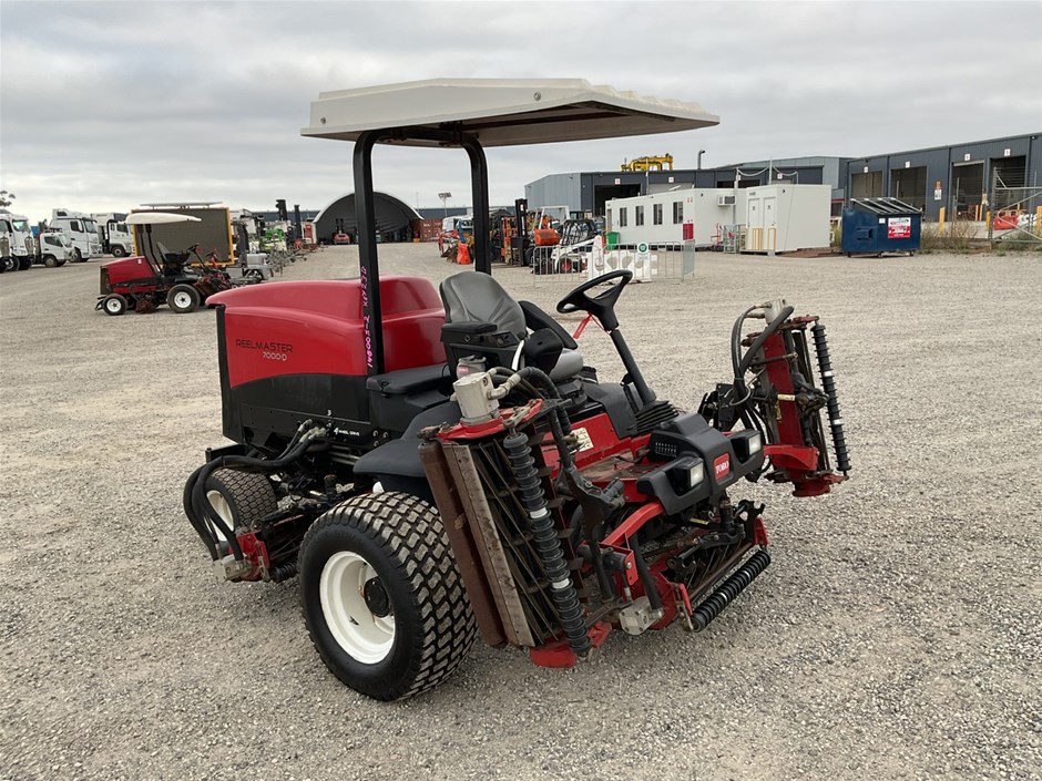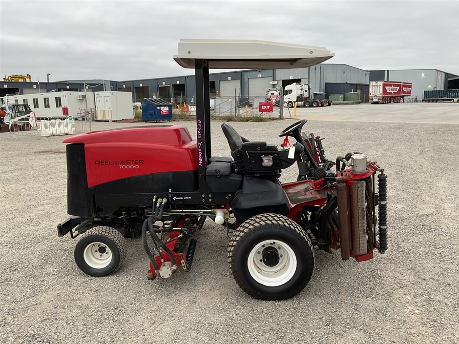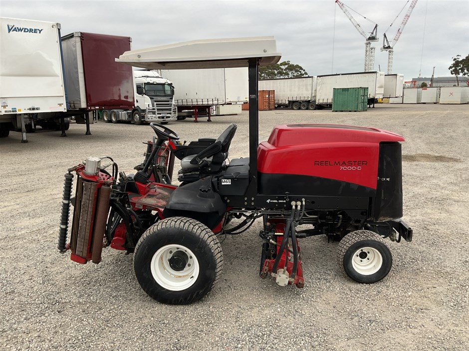 • 2012 Toro Reelmaste 7000D Ride-on Mower . 4WD . s/n 313000119. 4 cylinder diesel engine 36.5 kw .4329 hrs showing.Rops. Cutting width 3200 mm.
