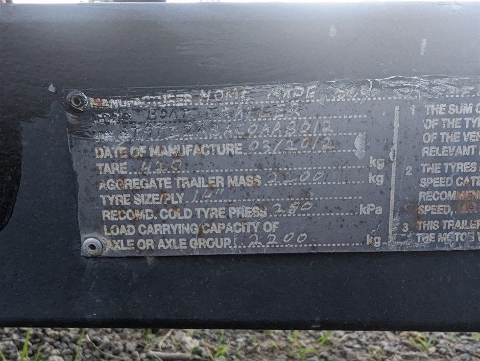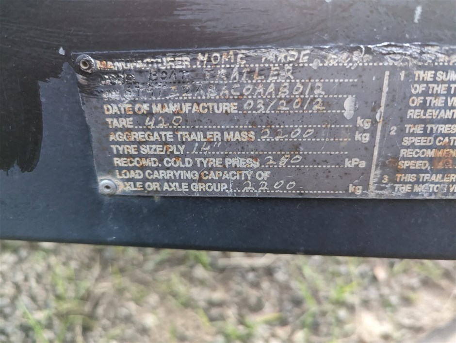 Please Note:The data form (if attached below the description in the lot) is a guide only. The assets are not driven or tested and description is based on walk around at the time of listing only. If engine is listed as turning over, this is based on a start-up only at the time of listing and has not been mechanically tested. There may be other damages, mechanical issues or body/hull/interior blemishes that have not been sighted or contained in the description at time of arrival or booking in. Therefore a full inspection is highly recommended prior to bidding.