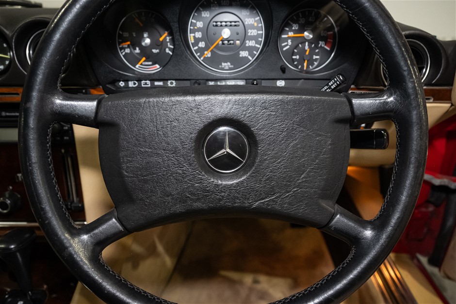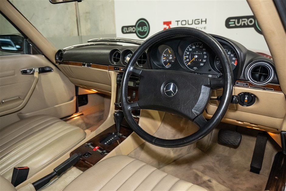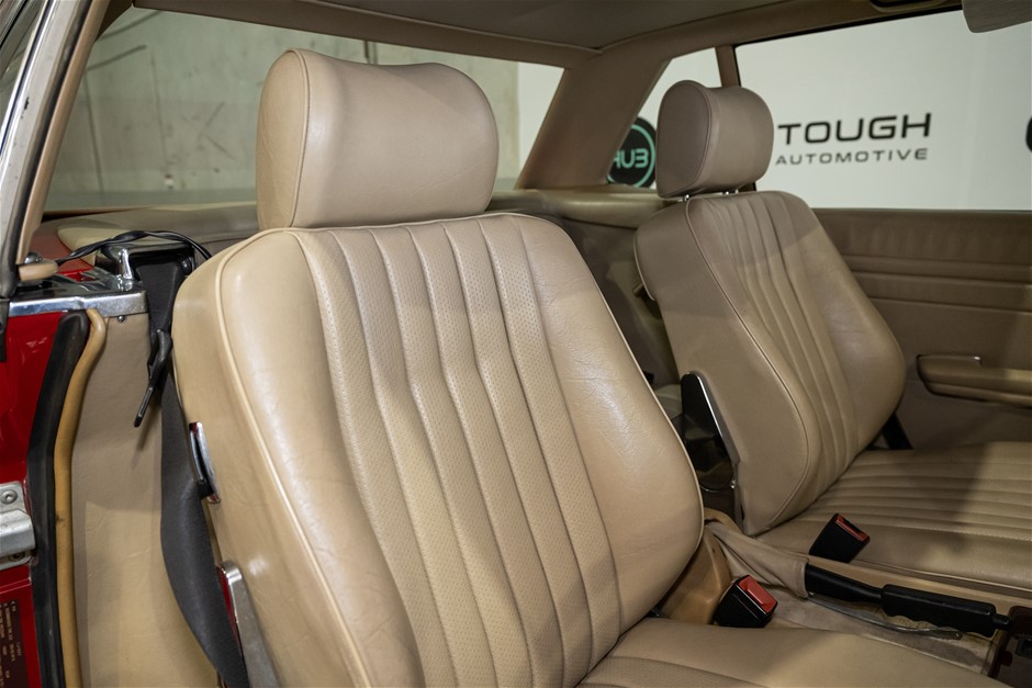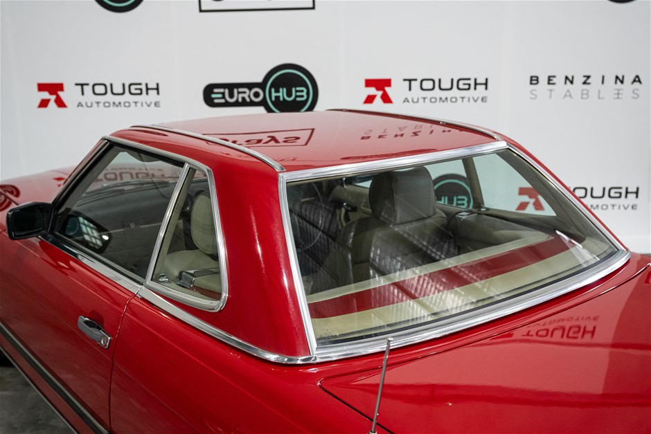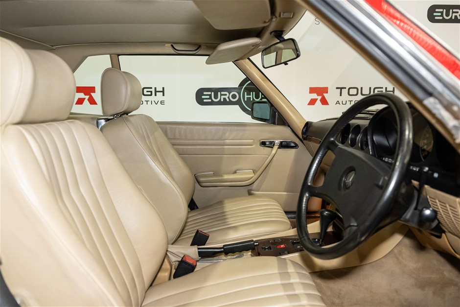 This flagship Mercedes-Benz R107 is presented in red with matching hardtop and contrasting beige leather trim. It is a credit to the owners of this classic in the way it has been maintained and cared for.