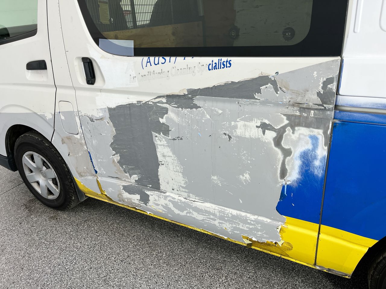 • Interior: Van cargo area has had a custom modification with shelves added, cargo area is scratched, dented and flooring is stained, Exterior: Paint on lhr sliding door sanded refer to photos, Paint touch up to lhr, home attempt of sticker removal recommend inspection