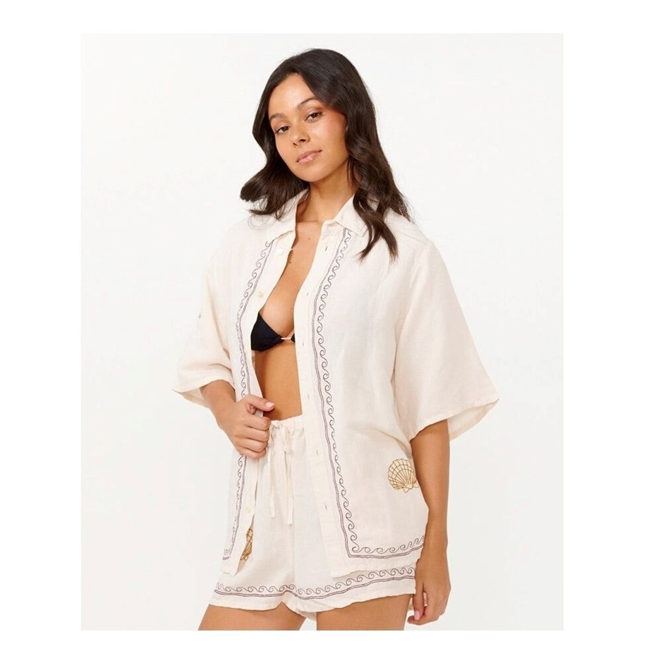 RIP CURL Women`s Beach Party Embroidered Short Sleeve Shirt, Size XS, Off White. RRP: $99.99. Buyers Note - Discount Freight Rates Apply to All Regional Areas(Code: 04IWSH-OW-XS) (333525-1)