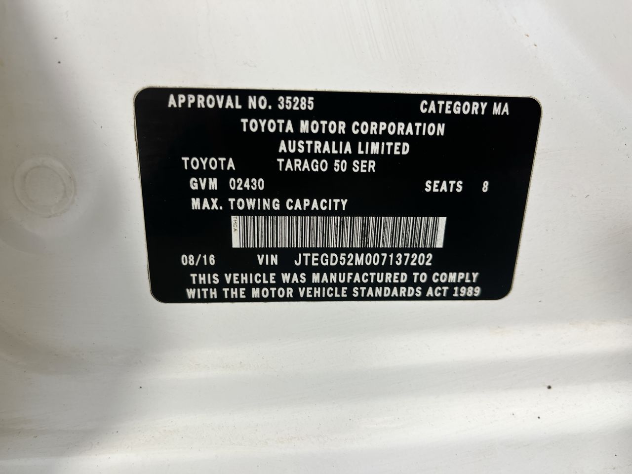 Part of Sale 2016 Toyota Tarago GLi AT 8 Seats People Mover 63,033 Klms