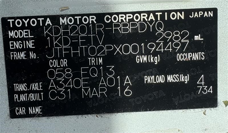 | Part of Sale | 2016 Toyota Hiace 200 Series RWD Automatic Van | ||||||||||||||