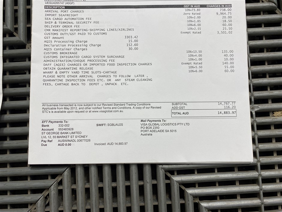 Assets must be removed from Grays' site within 5 days of auction close. For Interstate Buyers or 3rd Party collections you will have a one week grace period from the date of purchase stated on the invoice. This storage will be free of charge for you to arrange collection of the vehicle/item, after this date storage fees will be incurred at $50 per day or $250 per week. All storage fees must be made payable before the vehicle will be released.