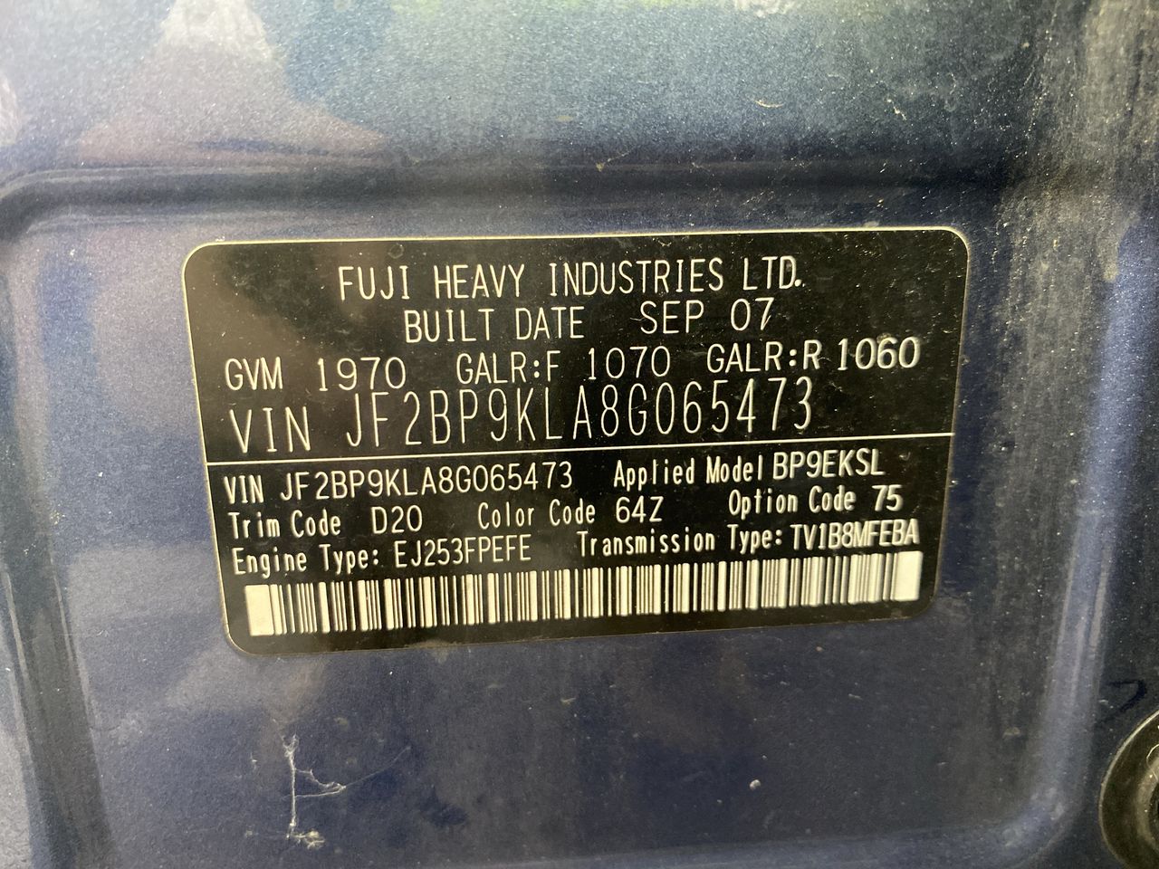 • VIN: JF2BP9KLA8G065473