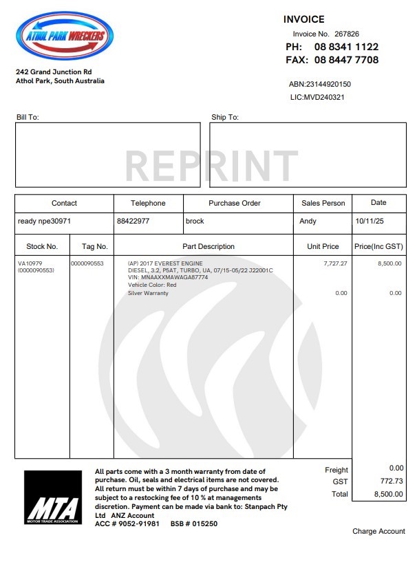 This sale is pick up only from 3 Maxwell Rd, Pooraka SA.