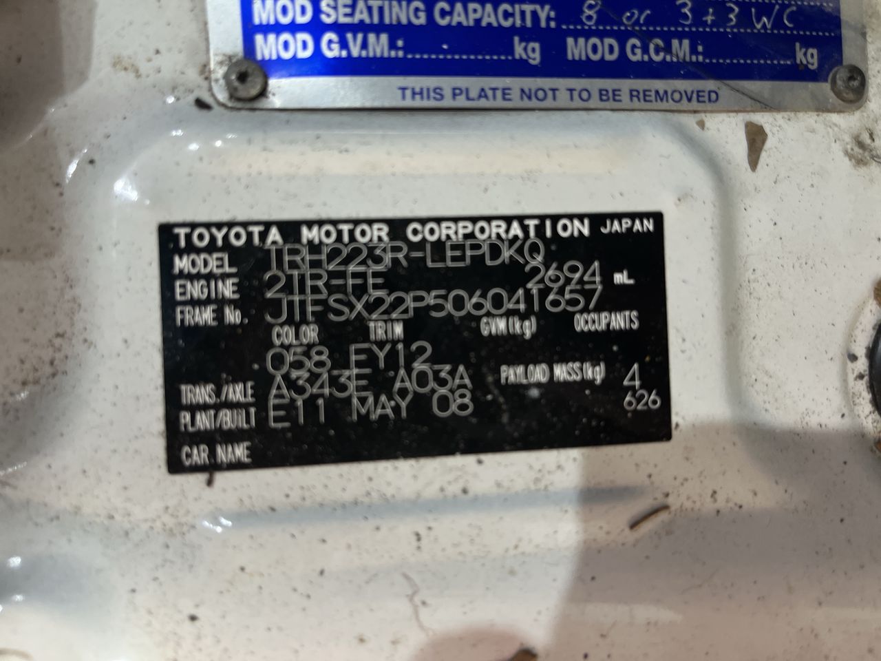 Part of Sale 2008 Toyota HiAce TRH223R Automatic 8 Seats Bus