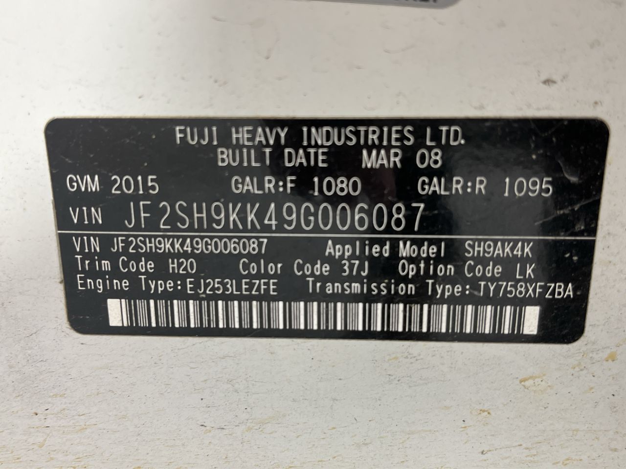 • VIN: JF2SH9KK49G006087