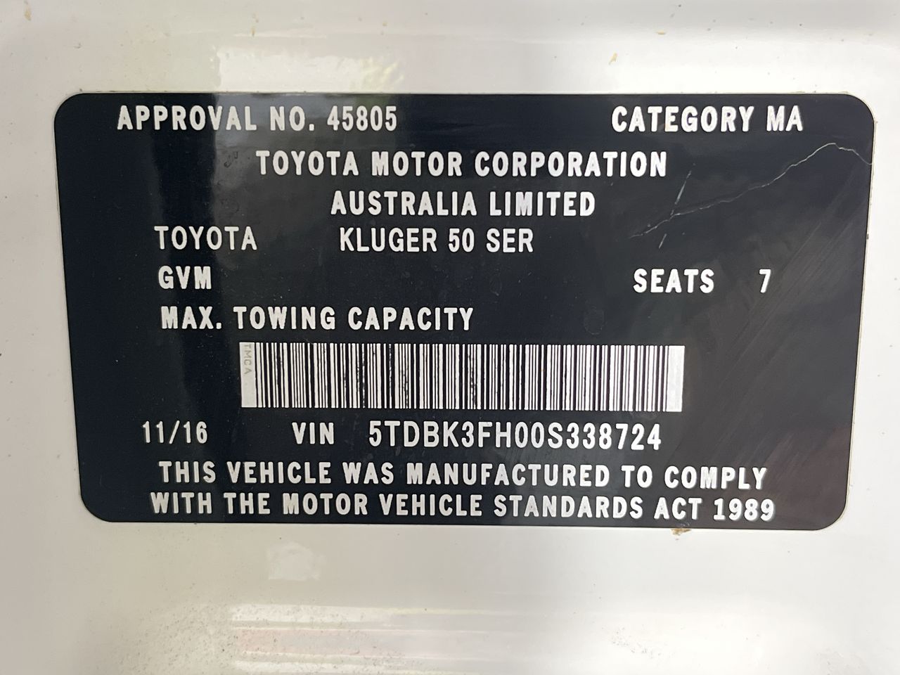 2016 Toyota Kluger 4X4 GX GSU55R Automatic 7 Seats Wagon