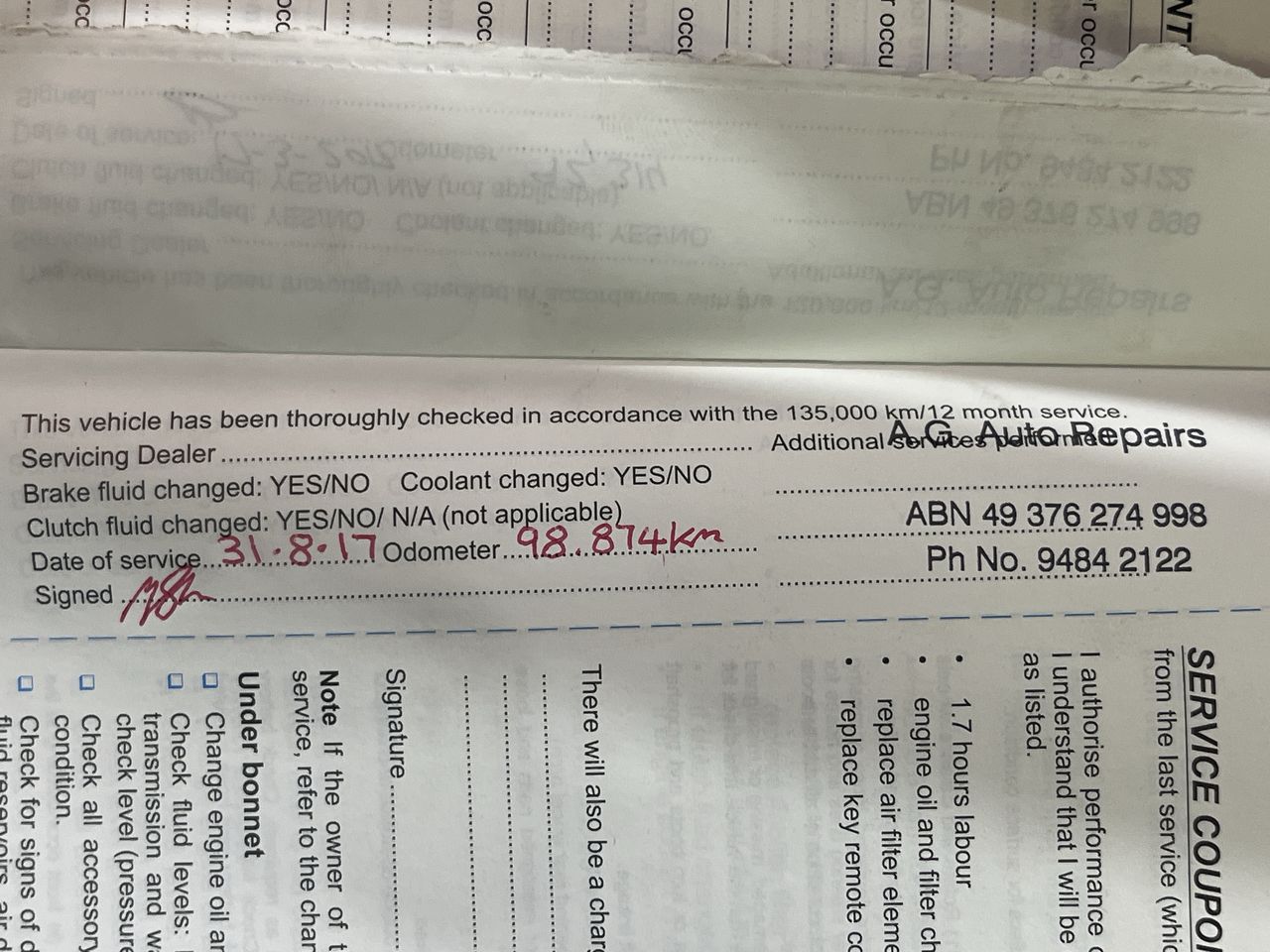 • Indicated Odometer Reading: 154852