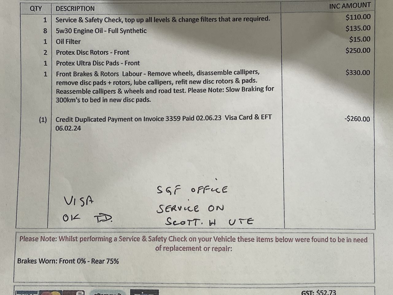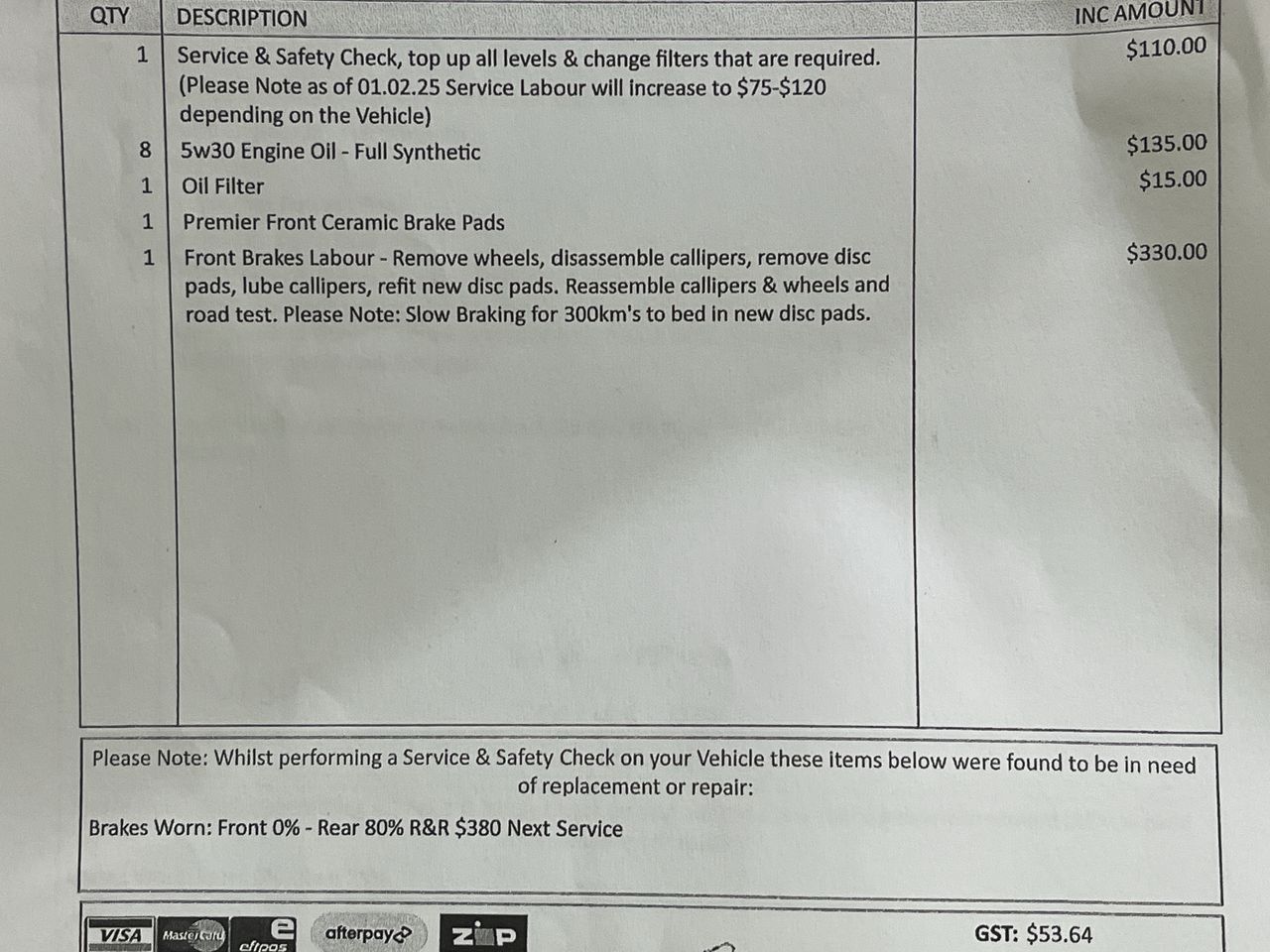 • Comment: Service Receipts Available