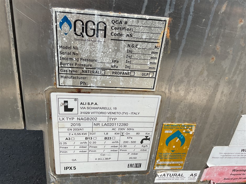 • Natural Gas, EN 203/A1, AC 230V 50Hz, Incoming Pressure 1.13kPa, Burner Pressure 1 kPa, LCD 10” Color Touch Screen, Year 2015.
