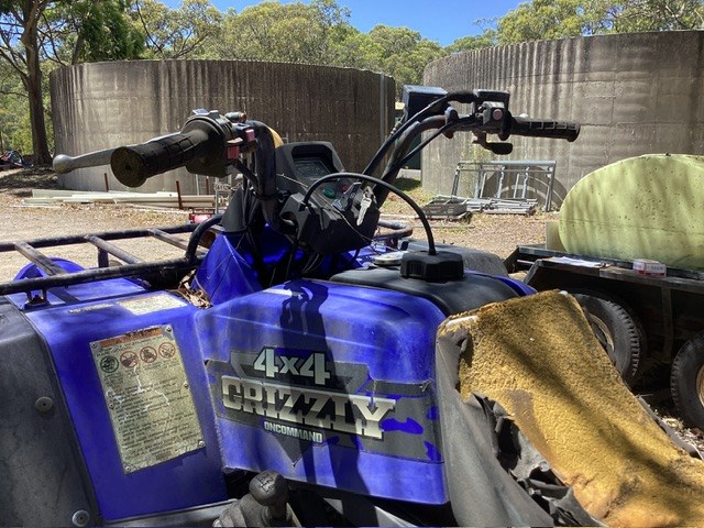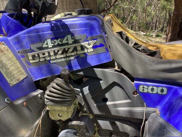 • Quad: Yamaha grizzly 4x4, 4 stroke 600cc petrol engine, 3,278 km showing, roll over protection bar, serial # 5GTC-010, low-high-neutral-reverse gear selector, front and rear racks, V belt driven ultramatic transmission, UNTESTED UNIT