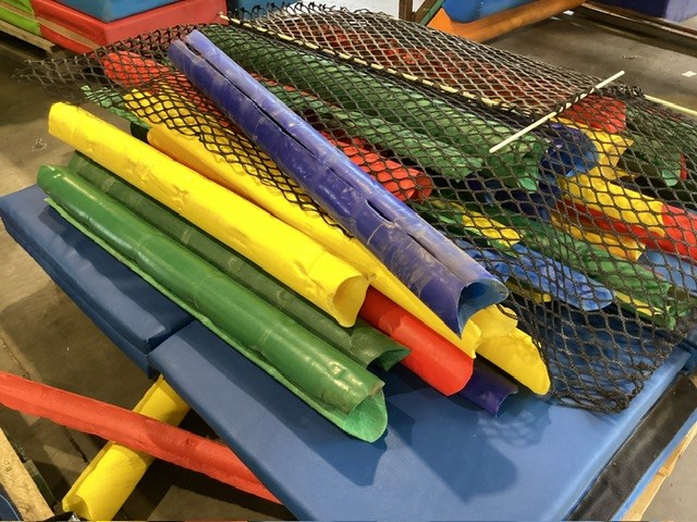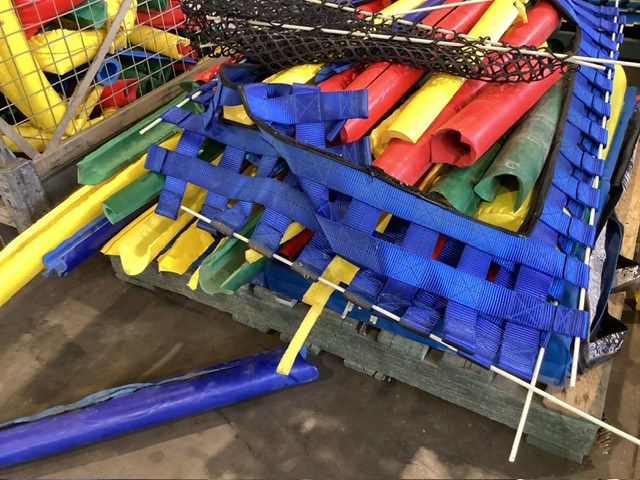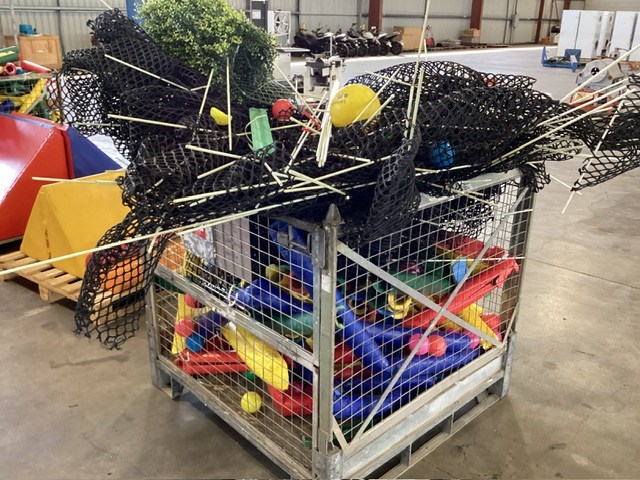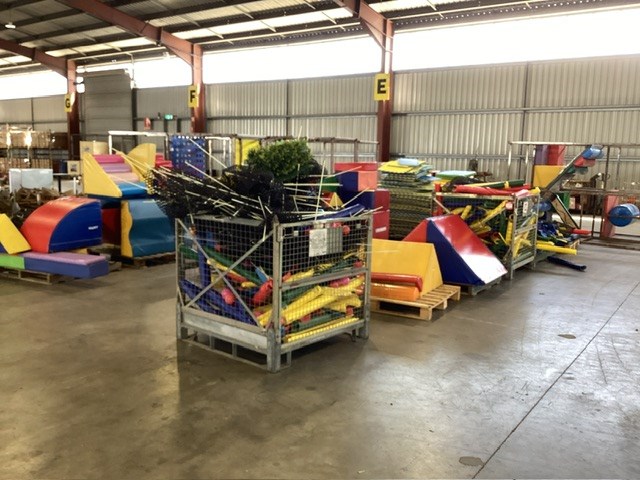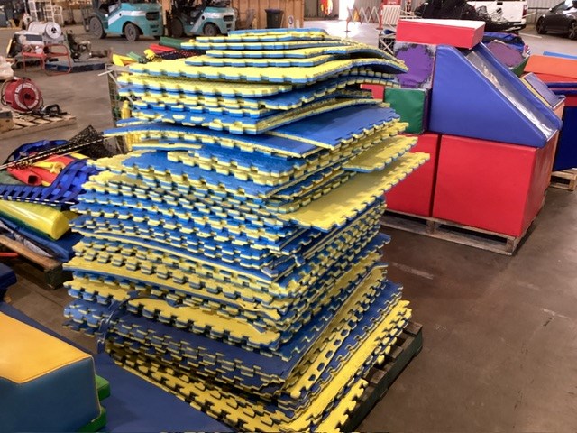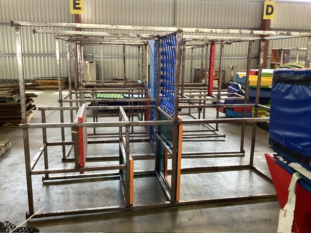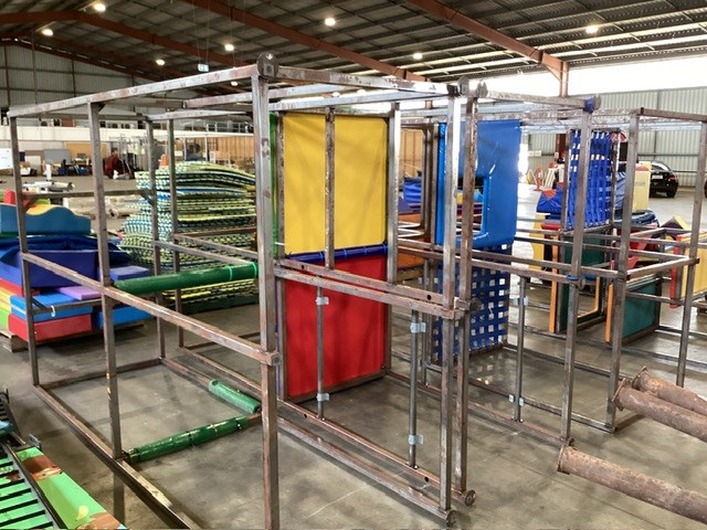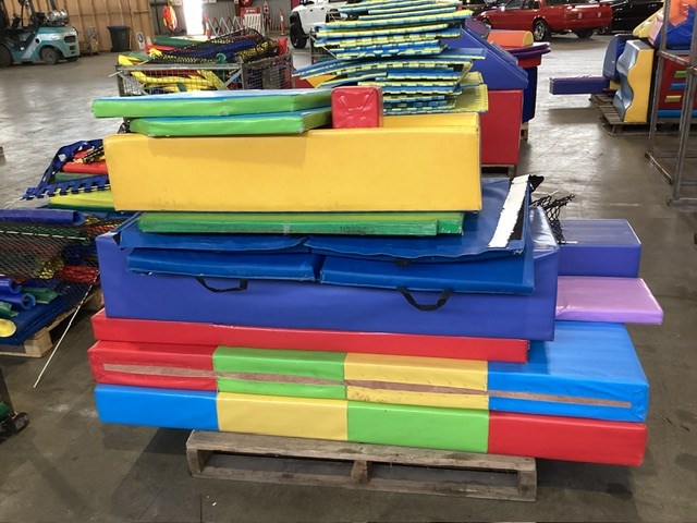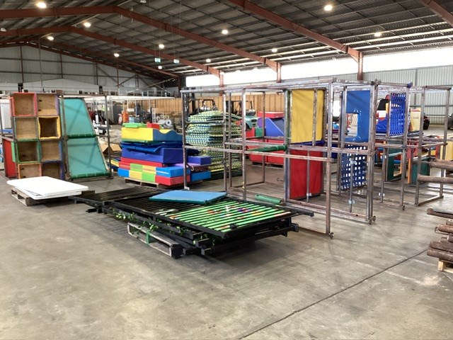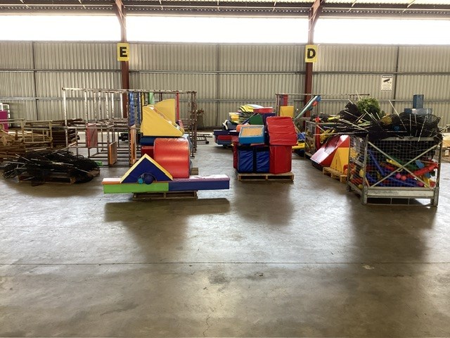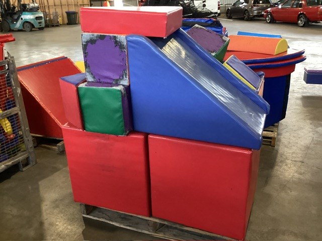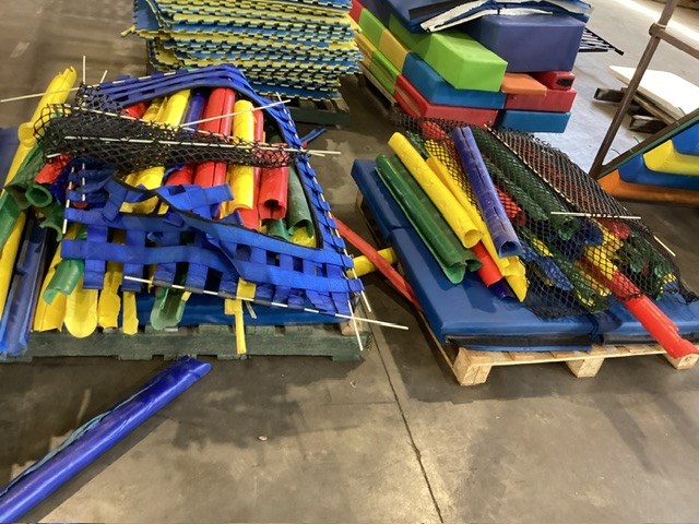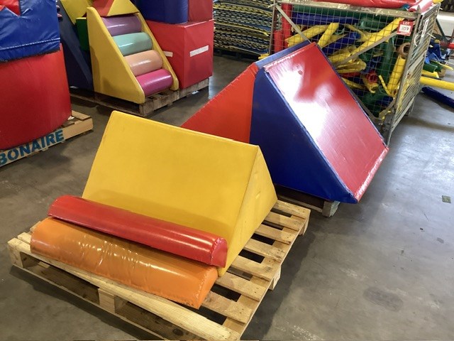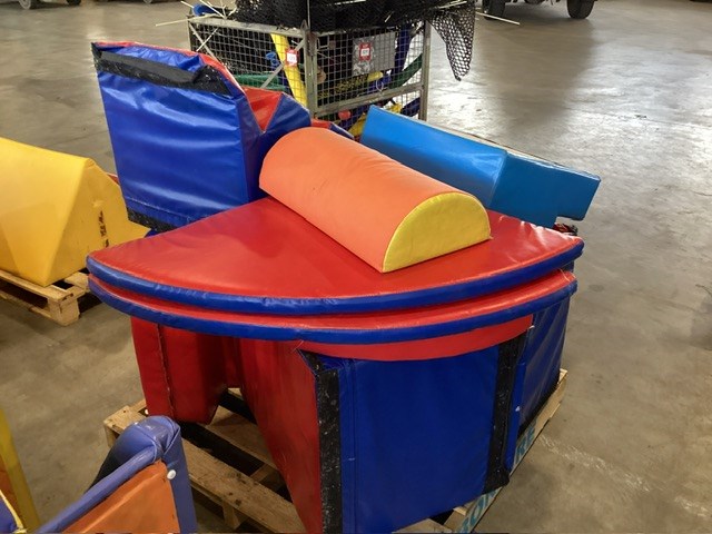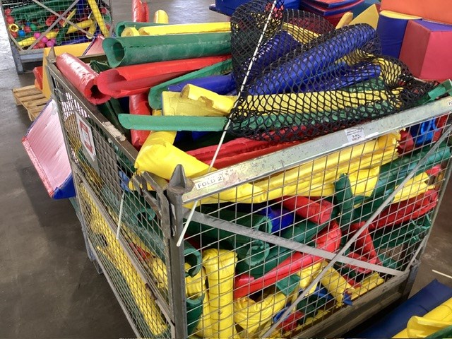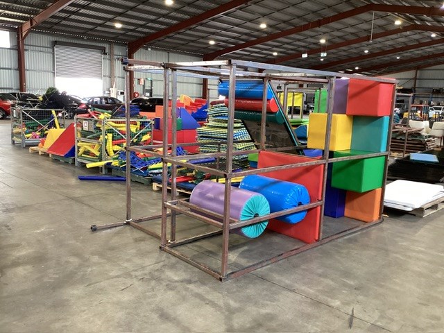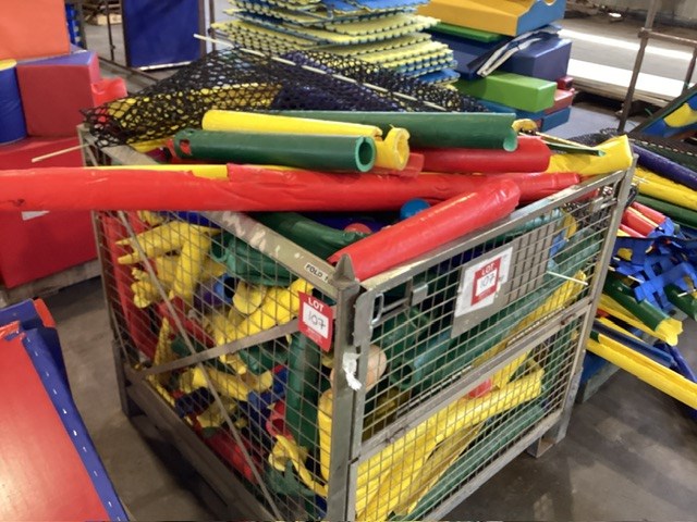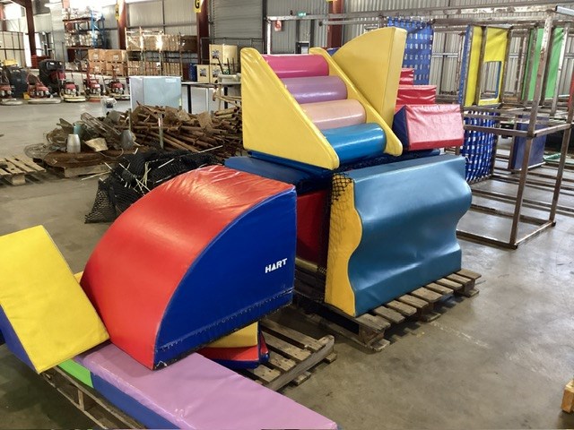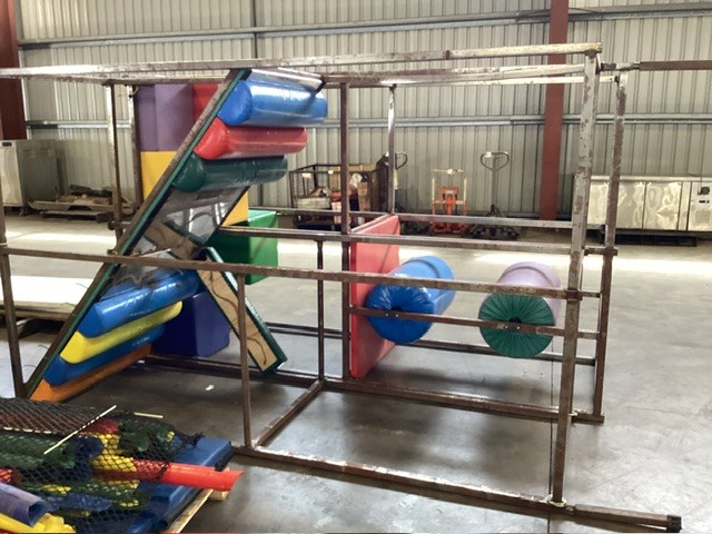 • Commercial Indoor Play Gym Equipment, 6 x steel framed with foam padding sections,(most padding not applied to frames), crash mats, foam sectioned flooring, padded ramp, padded palm tree, padded blocks, padded barrels, black safety nets, ball pit balls, powder coated fencing, various shaped pads, INSPECTION RECOMMENDED