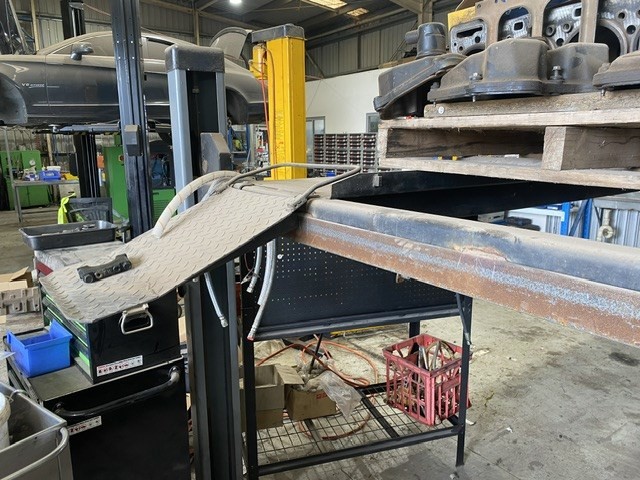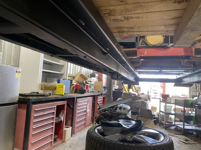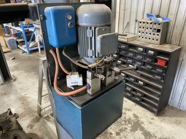 • Laycor 4 Post Hydraulic Hoist, platform, ramps, control box, last serviced 2021, hydraulic power pack, 3 phase power, CONTENTS NOT INCLUDED