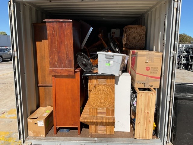 • Various homewares , lots of furniture tables cupboards chairs etc, various equipment. Unable to see full contents but container is full. Purchaser must organise full removal of contents.