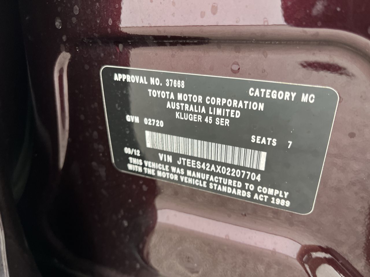2012 Toyota Kluger 4X4 GRANDE GSU45R Automatic 7 Seats Wagon