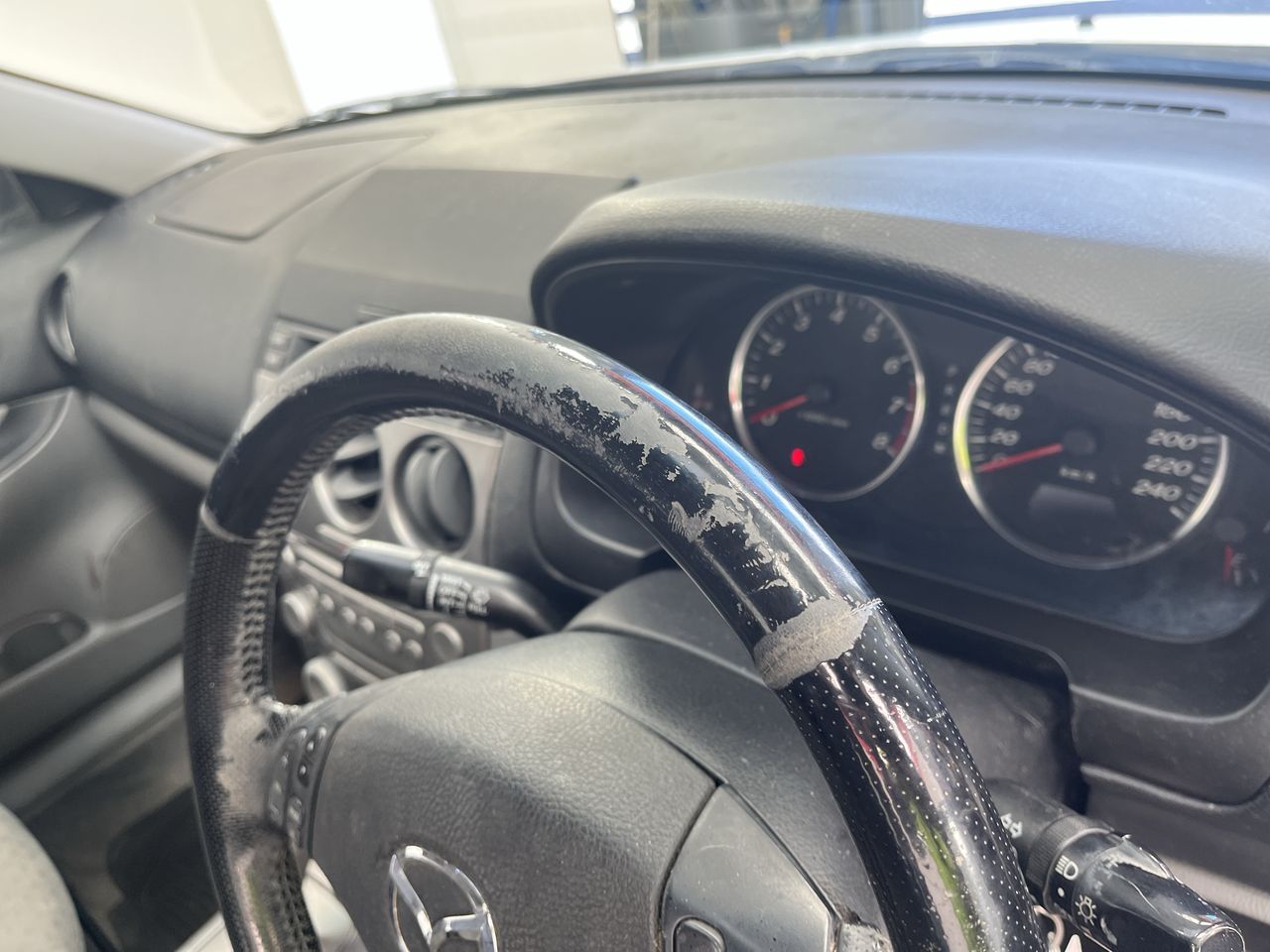 • Interior: Hood lining stained, steering wheel worn, Exterior: Front fog lights missing, tint bubbling, headlights foggy, tint lifting rear window.