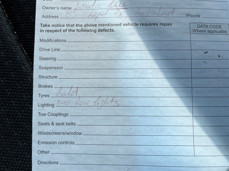 • Comment: Key turns in ignition, dash says engine immobilised. Vehicle has a defect notice indicating tyres are bald and no rear lights.