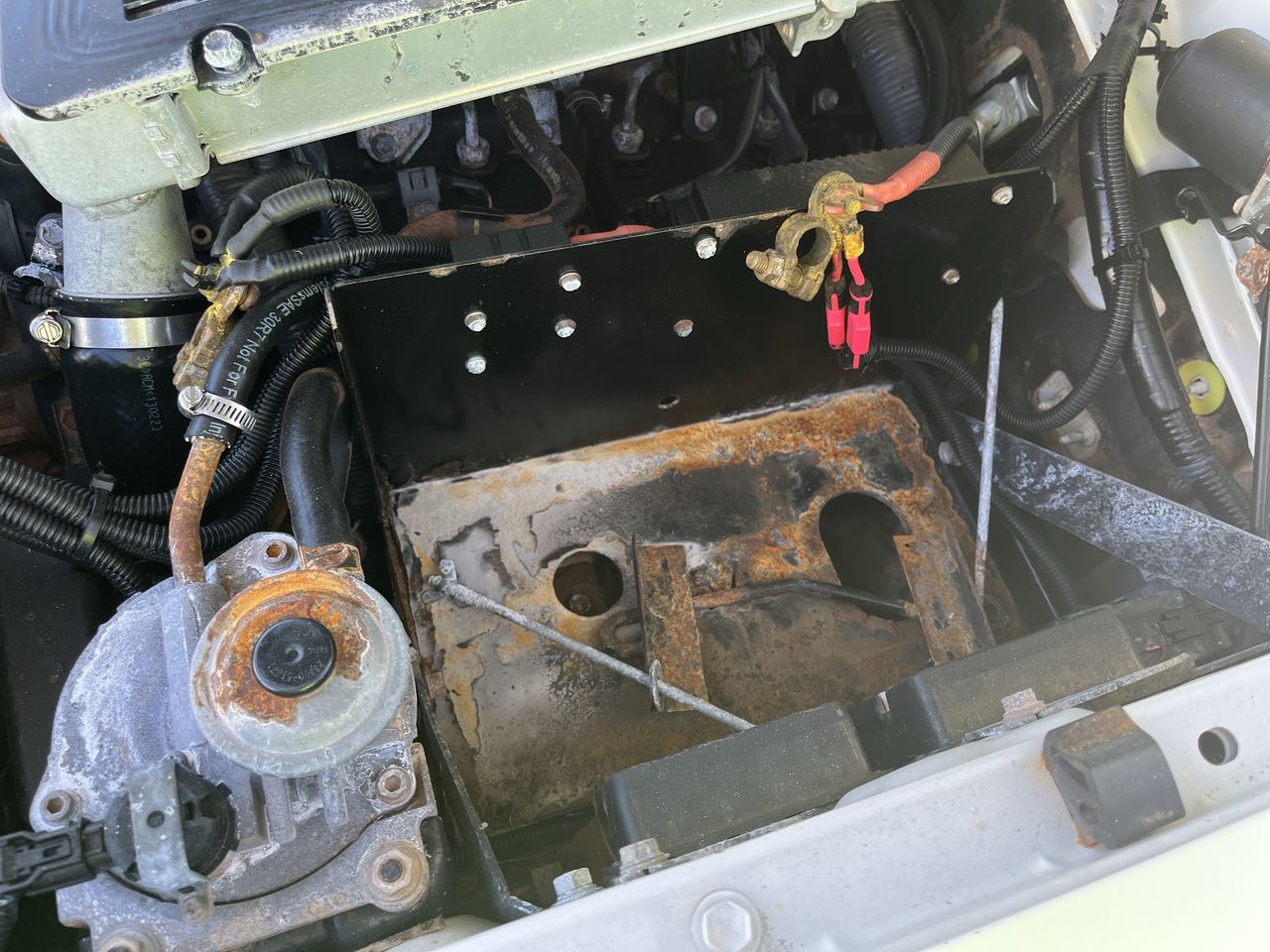 • Interior: Battery/alternator warning, Exterior: mismatched wheels, corrosion evident