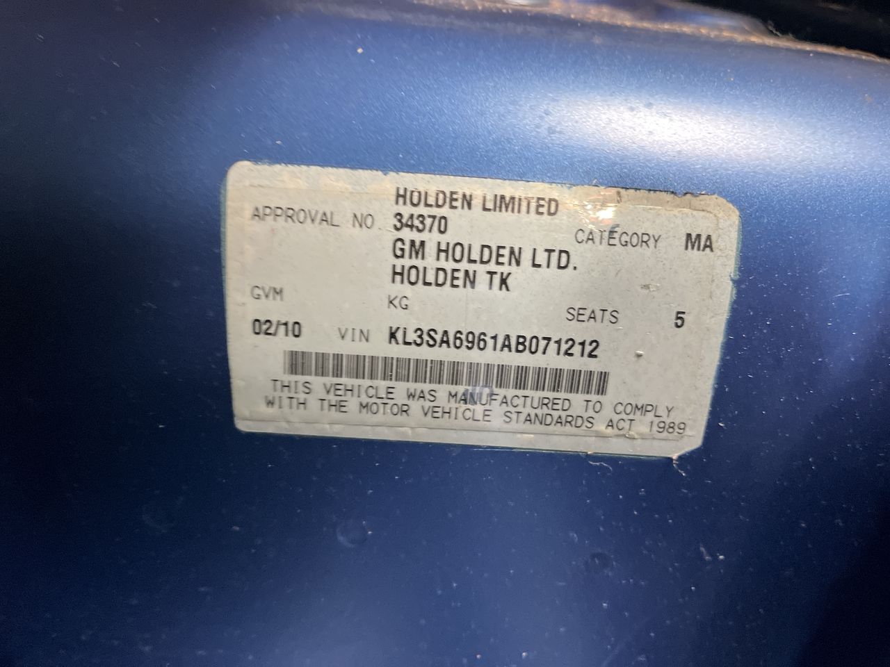 • VIN: KL3SA6961AB071212