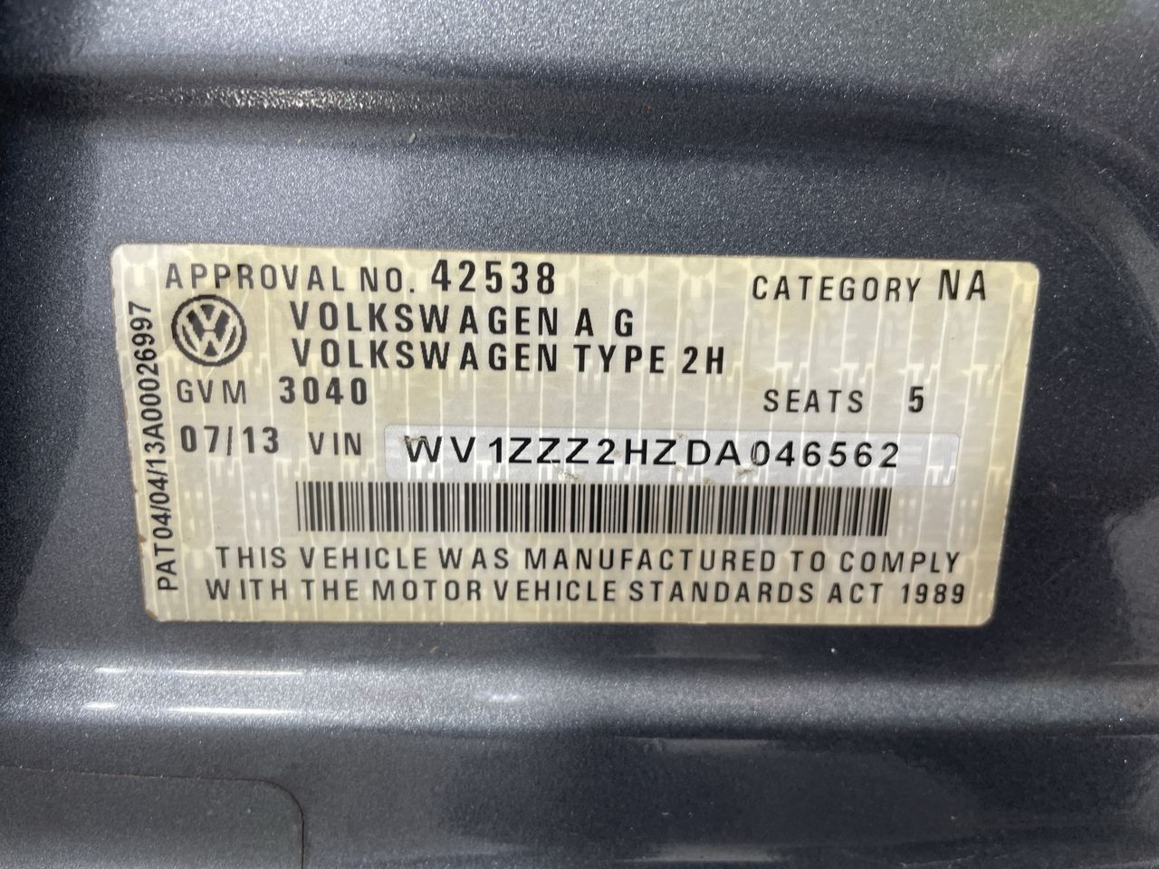• VIN: WV1ZZZ2HZDA046562