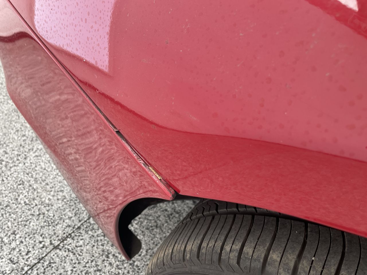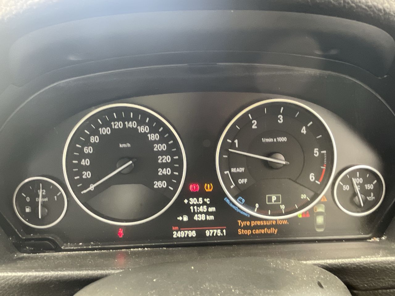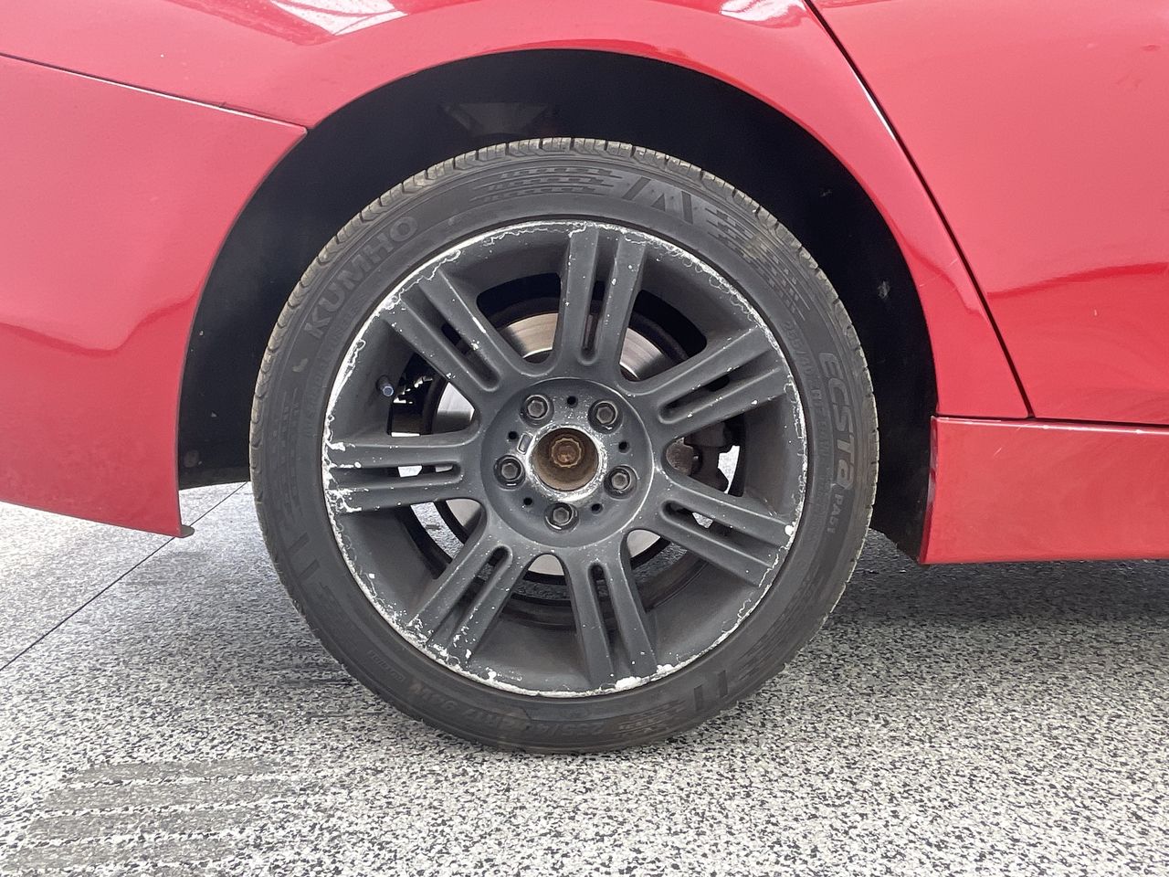 • Interior: TPS light on for front left tyre., Exterior: dislodge rear bumper, Windscreen chipped, Mismatched wheels.