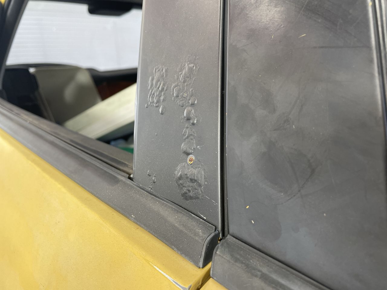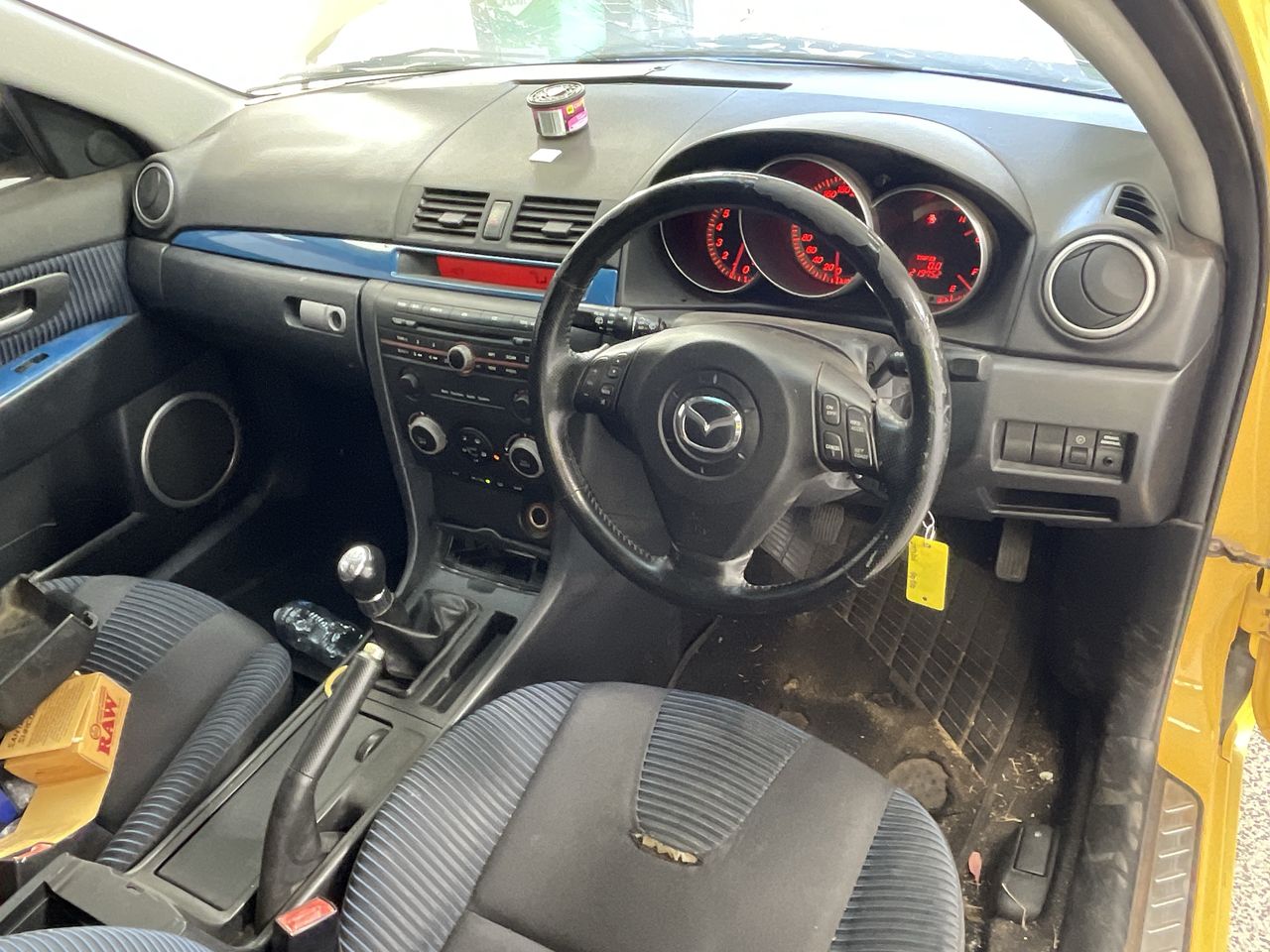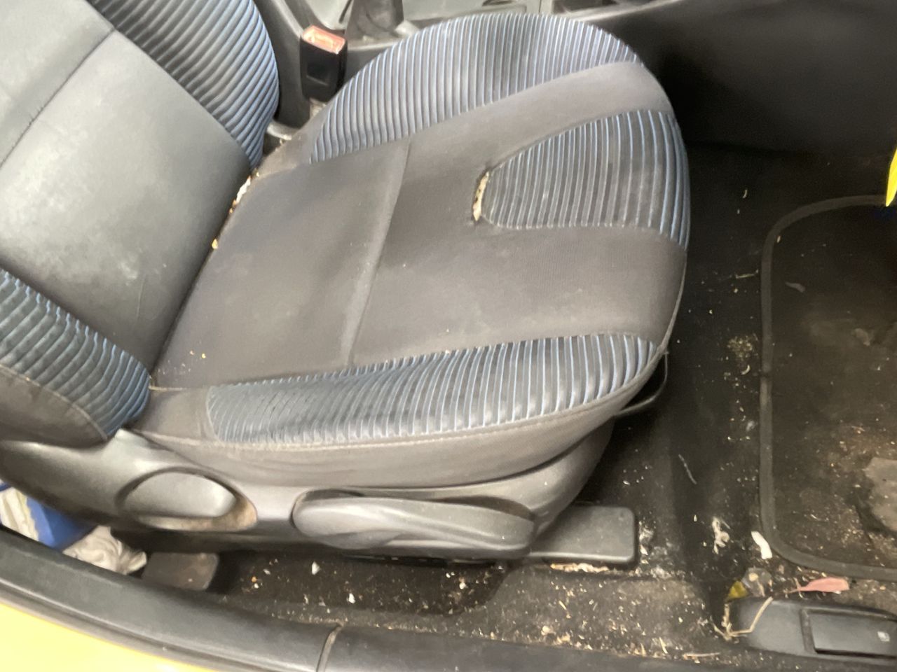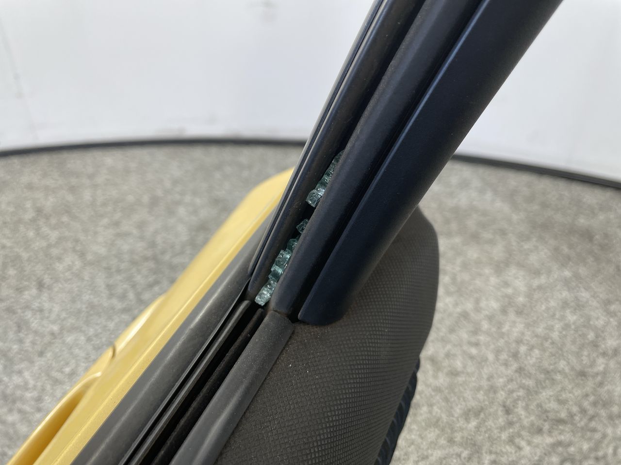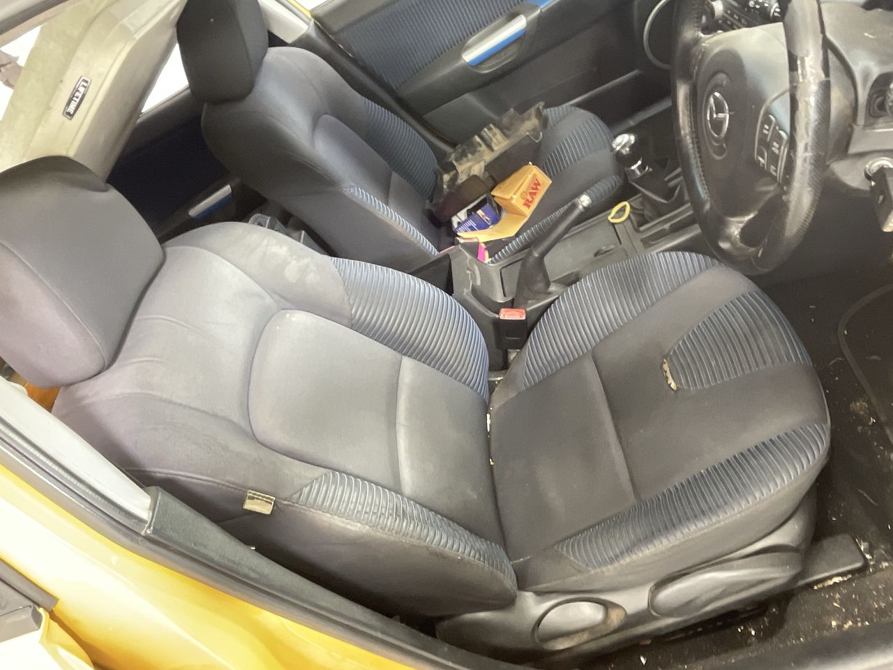 • Interior: Marks on roof lining, Steering wheel worn, Rear drivers side window missing, broken glass in car, general items inside vehicle, Exterior: Door pillar trim worn