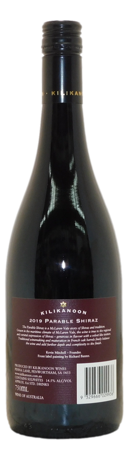 Kilikanoon’s Parable Shiraz showcases the regional expression of McLaren Vale typically showing mocha, coffee and brown spices alongside a core of ripe juicy red fruit with cedar and vanilin characters. The wine is vinified in a traditional manner; small parcels of fruit, are fermented on skins in open top vessels then basket pressed to a mixture of new and seasoned French oak casks for 22 months.