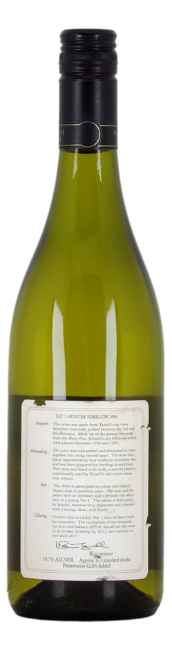 The **Tyrell’s Vat 1 Semillon 2006** is a refined, mature Hunter Valley Semillon with aromas of lemon zest, green apple, and subtle floral notes, complemented by hints of toast and honey from careful aging. On the palate, it is crisp and precise, with bright citrus flavors, fine minerality, and a clean, lingering finish. This wine showcases the elegance, freshness, and age-worthy character typical of classic Vat 1 Semillon.