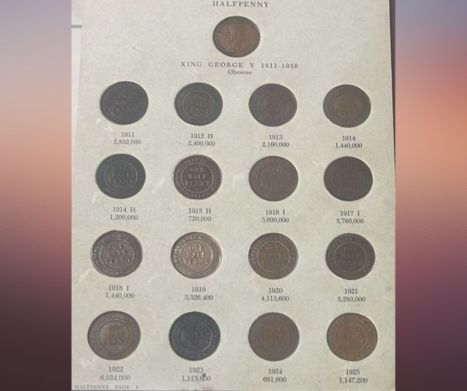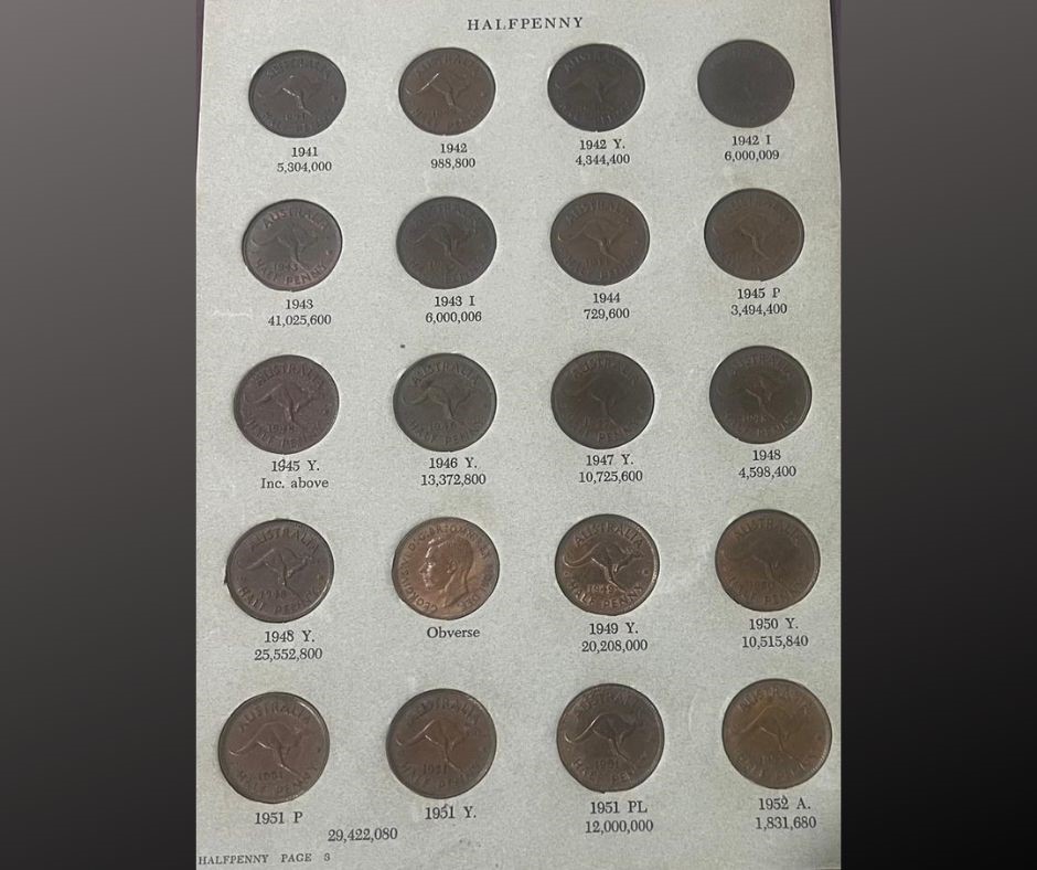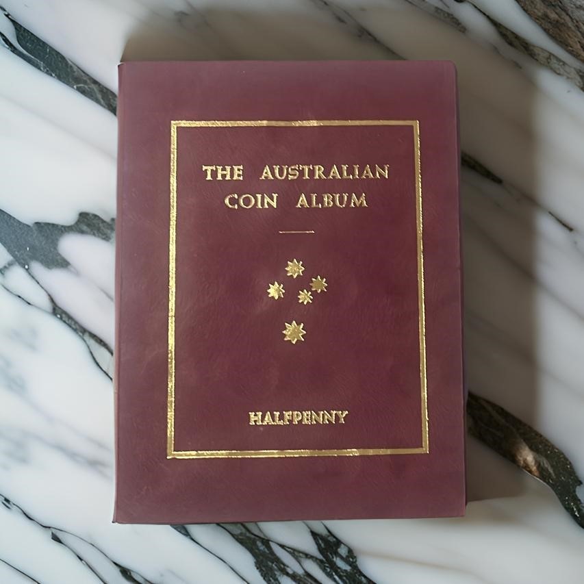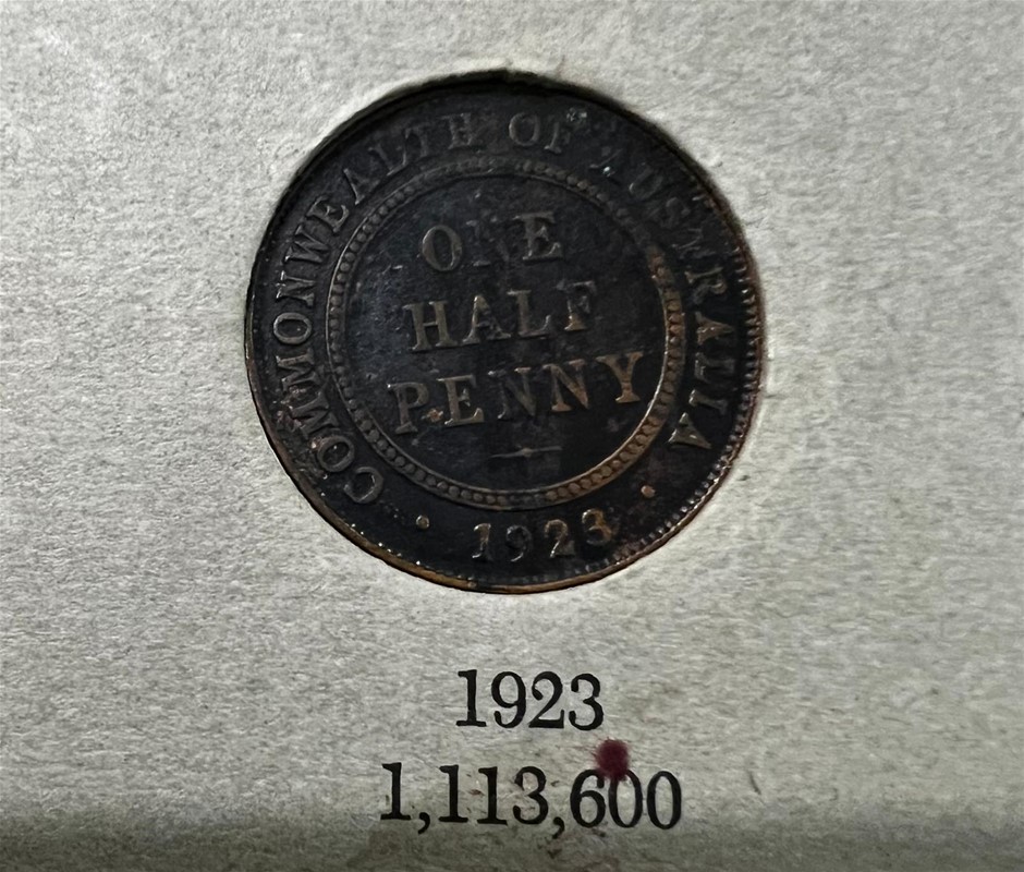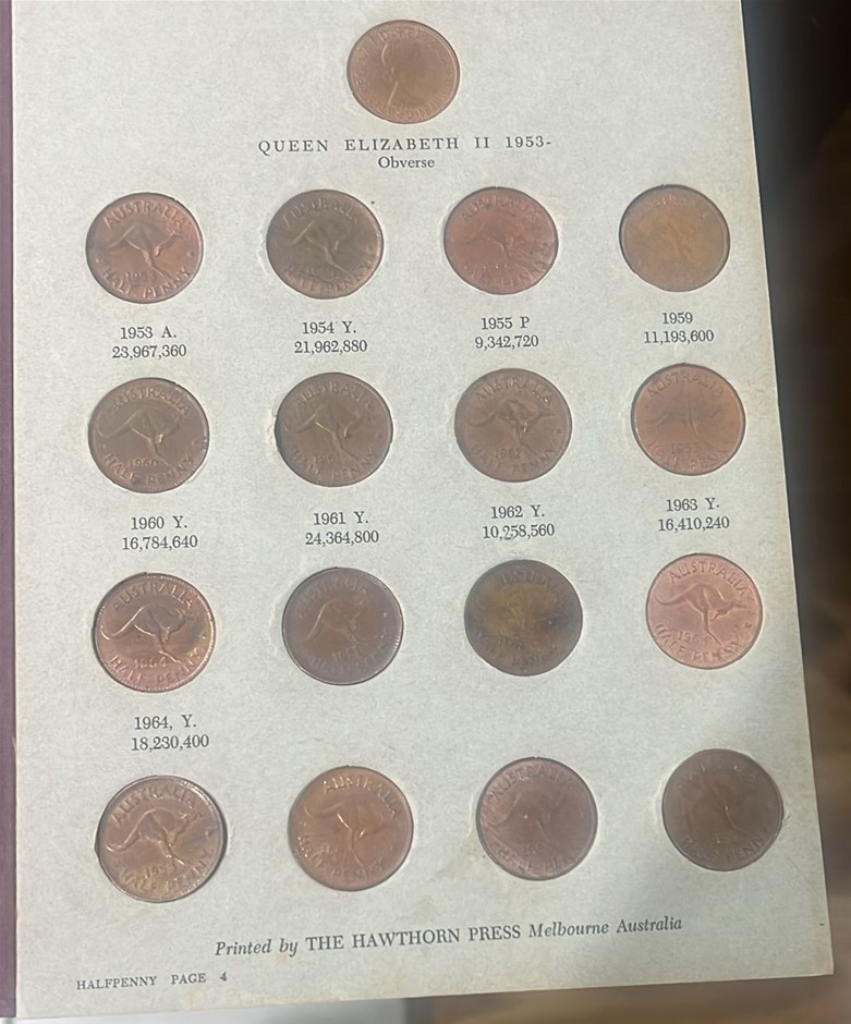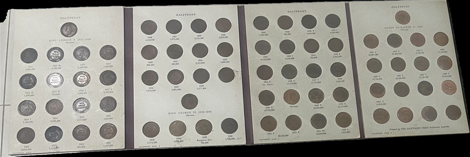 Deceased Estate from Tasmania Complete Denso Australia Pre Decimal Cooper Half Pennies Set of 70 Coins, which has 1923 Half Penny Catalogue Value $4750, half penny album has some wear & tear and part of Album glue Catalogue value of set is approx $6,750 Australian Coins & Banknote seventeenth edition by Greg Mcdonald page 73-74) (314441-2)