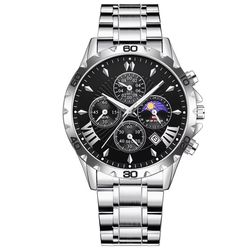 The watch has a multifunctional dial, offering 7 in 1 multifunctional innovative timing, simple and easy to understand sub dial, calander window, stopwatch dial, 24H timing dial and luminous pointer. It also has the added feature of being water resistant and has a glow in the dark face.
