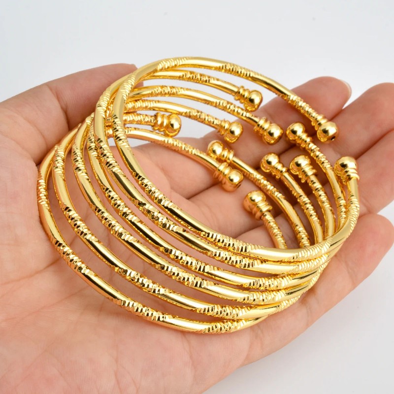 DescriptionThe NNEOBA 6Pcs Dubai Bangles Set is designed for women who value timeless jewelry pieces that can be worn across occasions. Crafted from durable copper with a gold-color finish, these bangles add elegance whether styled for daily wear or special celebrations. The set includes six pieces, offering flexibility to wear them individually or layered for a bold look.
