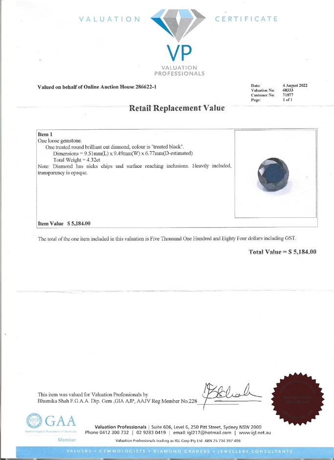 Valuation conducted by a member of the Australian Association of Jewellery Valuers (AAJV). The Estimated Replacement Value is the opinion of the valuer, the estimated cost of having the piece replaced based on the current market price of the stones and precious metal in the Australian market. As the grading of precious stones and diamonds is not as exact art and due to market fluctuations, variations may occur. Further information on the valuation methodology can be found on the Authenticity Report Tab. The estimated replacement value can be used for insurance purposes but does not represent a retail price or the resale value of the piece. The estimated replacement value will be shown on the original authenticity report issued to the successful purchaser.